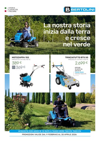 I prezzi indicati in questa pubblicazione sono consigliati dal produttore, non vincolanti, comprensivi di IVA (22%) imposta per legge, validi dal 9 febbraio al 30 aprile 2026 solo presso i Rivenditori aderenti e fino ad esaurimento scorte dedicate alla promozione. I prezzi possono variare in seguito ad oscillazioni valutarie o particolari normative fiscali. I prezzi indicati non prevedono la consegna a domicilio. Le immagini sono solo rappresentative e non possono essere oggetto di rivendicazioni. Ci scusiamo per eventuali errori di stampa. Copyright 2026 Bertolini. Tutti i diritti riservati.
