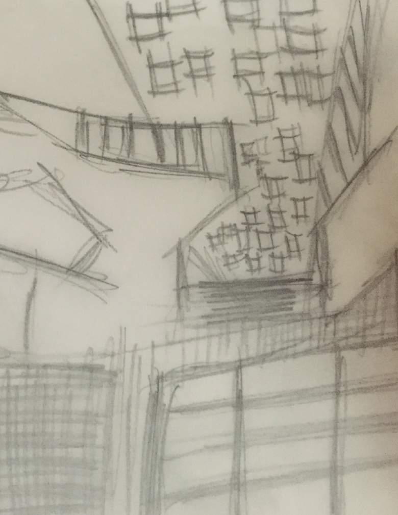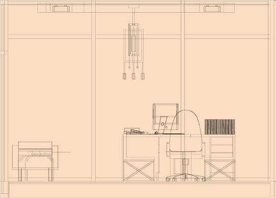 This room completes a cycle. It started as patterns on the floor that became voids on the walls , and after that it became geometric lines on the celling.