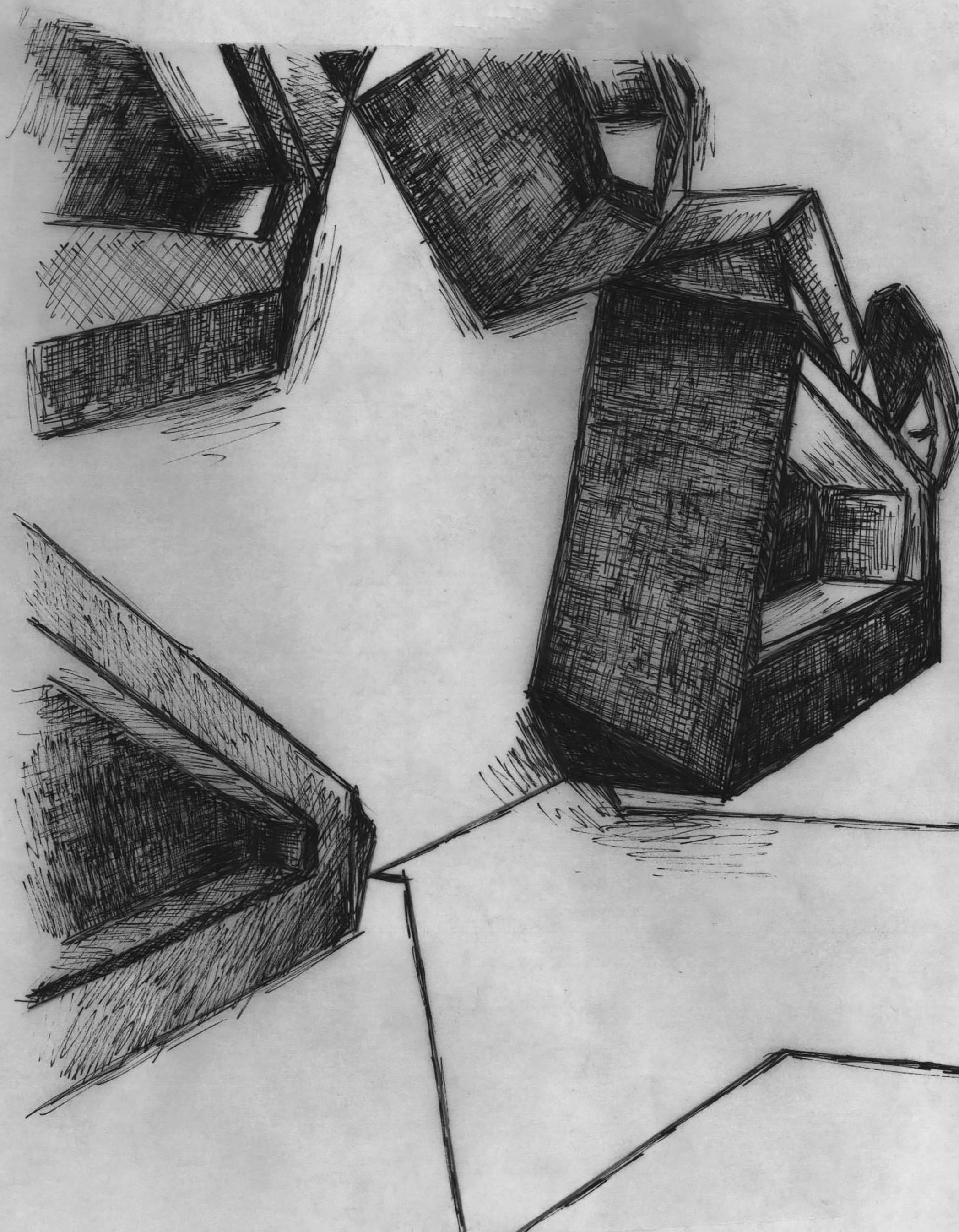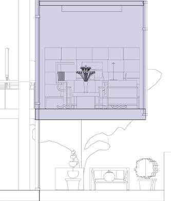It is located in the entry level, in using the same thoughts, concepts, and techniques, but in a different way and for a different function. The shape of the cube in this level comes out of the walls creating boxes that has voids in the middle of it. The display windows functions as a stand to hold the artwork. This style was used before but only as a gemotric shape, now it is used to serve a practical function of holding arwork. The voids of the walls and the floor patterns creates beutiful symmetry and connection.