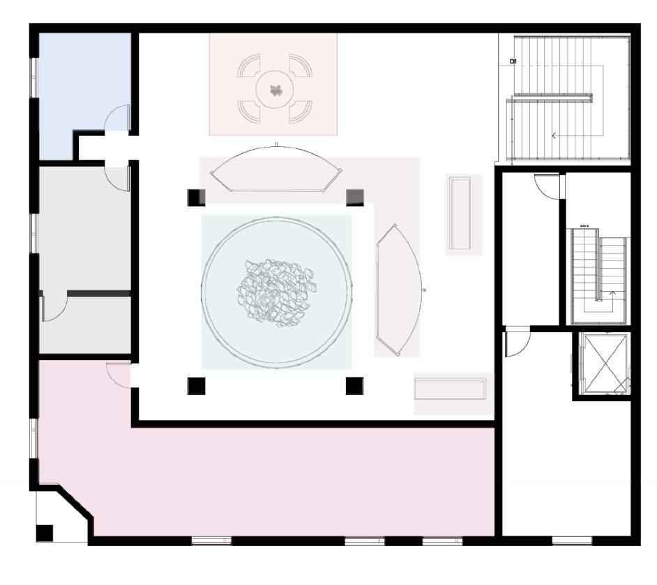 Realize the connection between the floor patterns and the shapes of the walls. It follow the patterns in a lovely way. It gives the floor plan this unique look, and it makes it look like a piece of art itself. In the exhibition area the art works and paintings on the walls are the only focal points in this scene. Moreover, these lines on the ceiling creates a kind of completeness to the space, it gives a sense of entirty to our eyes because nothing’s left empty.