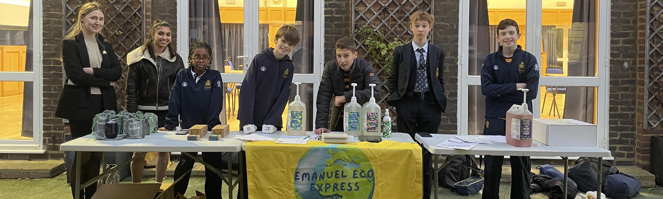 The Emanuel Eco Committee have launched their first ever pop-up eco refill shop to help tackle single-use plastic and waste. Before our onsite Year 7 parents evening they sold over 56 portions of washing-up liquid, laundry liquid, hand soap and shower gel, as well as lots of eco friendly soap bars.The wonderfully bright Emanuel Eco Express banner was designed by Milo, Year 7, and is made from recycled nylon.