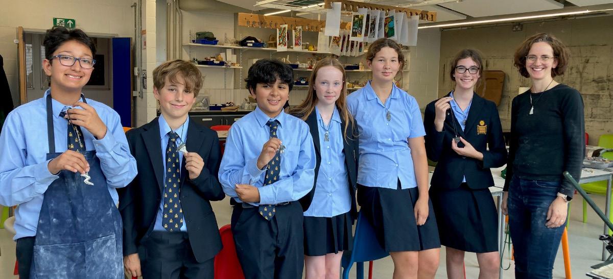 During Open Day on Saturday 16th September Emanuel art scholars took part in two workshops. The senior scholars created a series of colourful monotype prints led by OE artist Rosa Roberts. The monotype technique encouraged students to simplify form and use colour boldly. Briony Marshall led a pewter casting workshop for the junior scholars where they created intricate and detailed pendants. The students, and Mr Reed and Ms Burnett, were very excited to see molten pewter being poured into the students’ plaster casts
