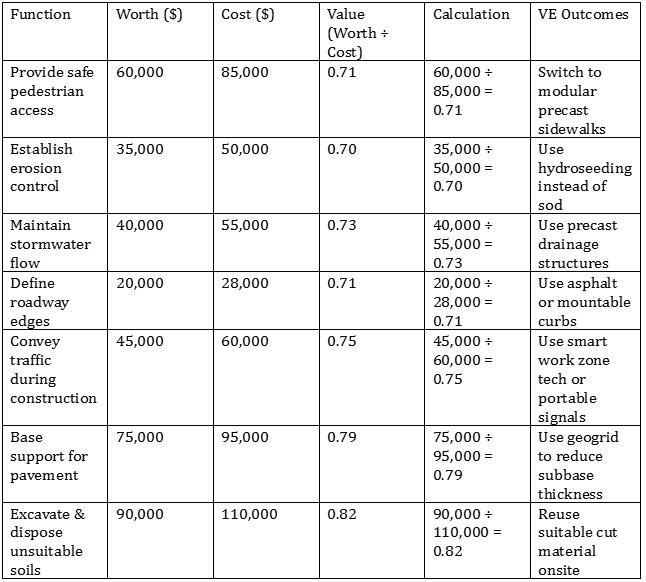 Value Engineering (VE) was applied to identify opportunities for functional cost savings without compromising performance, safety, or NYSDOT standards. For each project function, an estimated Worth (the lowest reasonable cost to perform the function e ectively) was compared against the Cost (anticipated expenditure using standard NYSDOT practices). The ratio of Worth to Cost (Value = Worth ÷ Cost) guided whether an alternative method or material could yield a more economical solution.
