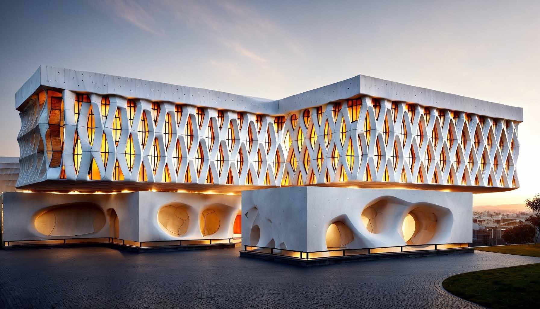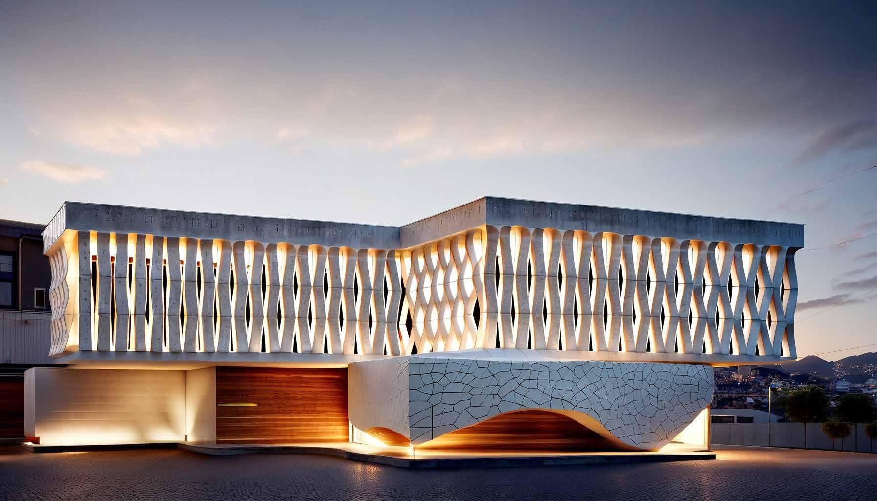 In an e ort to improve a boring, at building face, an interweaving pattern was chosen. Not subjected to structural load, this pattern can be made using recycled aggregates.