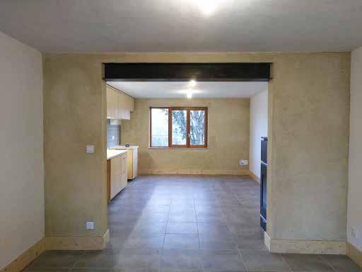 Vue de l’espace de vie vers la cuisine - avec ses enduits terre et chaux-marbre fin