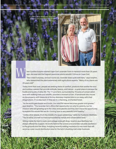 hen Cynthia Sutphin started Cape Cod Lavender Farm in Harwich more than 25 years ago, she was told the fragrant perennial plants wouldn’t thrive on Cape Cod. “But I tried it anyway, and as it turns out, lavender does quite well here,” says Sutphin, who researched the plant extensively with agriculture experts. “Many of my plants are 25 years old!” Today more than ever, people are seeking items of comfort, products that soothe the soul and outdoor spaces that provide solitude, beauty, and nature—a quiet place to escape the hustle and bustle of daily life. The 11-acre farm, surrounded by 75 acres of conservation land with walking trails and wildlife, provides a moment of zen. A handmade fairy house on the property with treasures at its tiny doorstep inspires kids to run away with their imaginations. It’s a step back in time set in a charming, enchanted forest. “As the world gets busier and busier, the need for nature becomes greater and greater,” says Sutphin. “The lavender farm offers that opportunity not only for parents, but for children who are growing up in the cities and suburbs and they don’t have the opportunity to explore the woods like we do. Coming here is very peaceful and healthy.” “Unlike other places, it’s in the middle of a quasi-wilderness,” adds her husband, Matthew. “You’re all by yourself out here surrounded by nature and conservation land.” Sitting inside the farm’s rustic and cottage-style gift shop, Sutphin says Matthew has always offered his support. He works behind the scenes and provides valuable aesthetics to the grounds and the shop, including recently adding insulation to one room that will serve as a year-round distribution area for the farm’s bustling mail-order business.