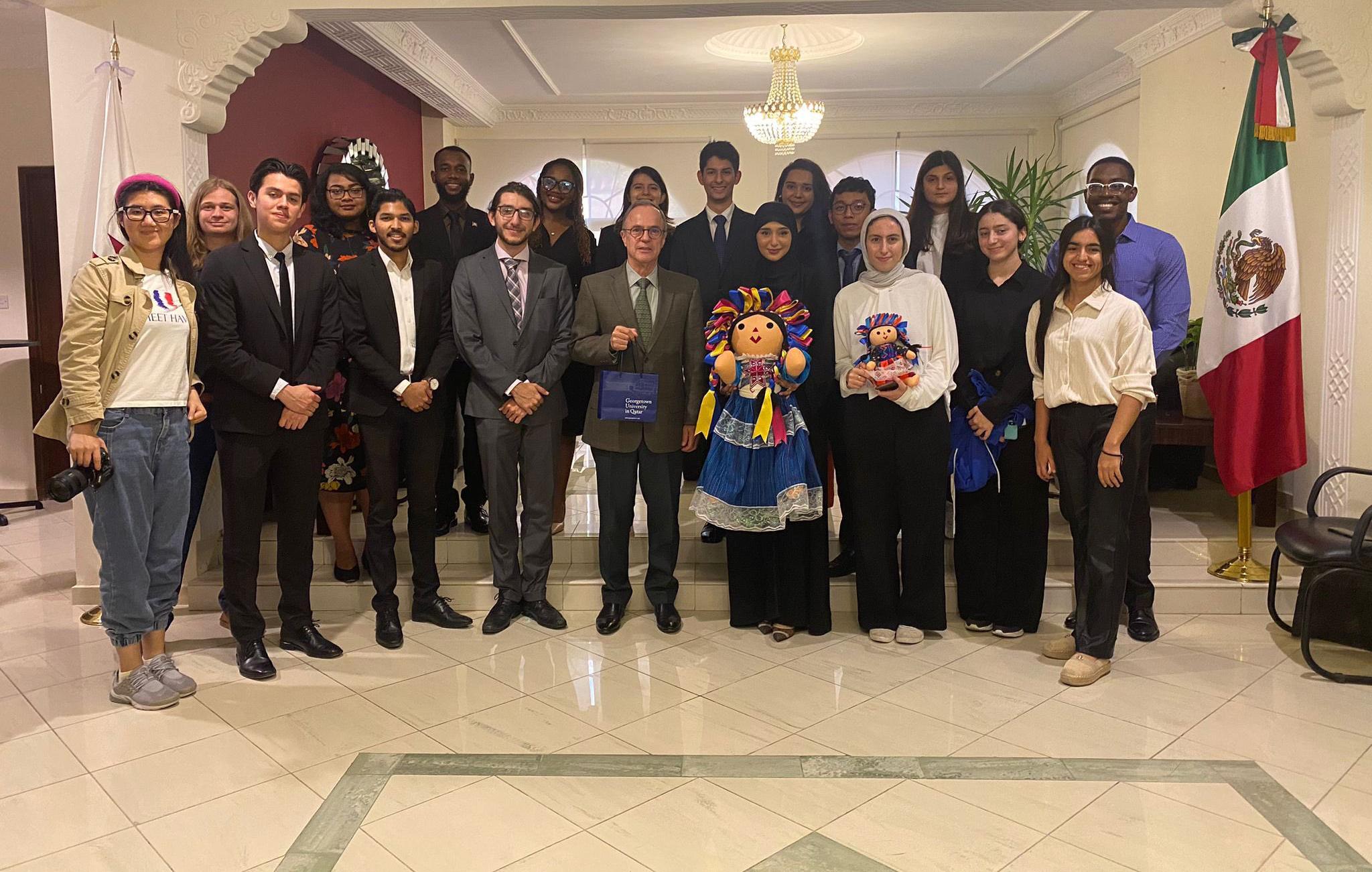 Enatenciónalainvitaciónquele formulóQatarFoundation,eltitularde estaEmbajada,juntoconlos embajadoresdeotrospaísesacreditados enDoha,el15demarzocumplió funcionesdeacompañamientoy asesoríadeunadelegacióndejóvenes estudiantesdeLíbanoque,conla representaciónsimbólicadeMéxico, participaronenelejercicio Modelo InternacionaldeNacionesUnidasde LaHaya (TheHagueInternational ModelUnitedNations,THIMUN).