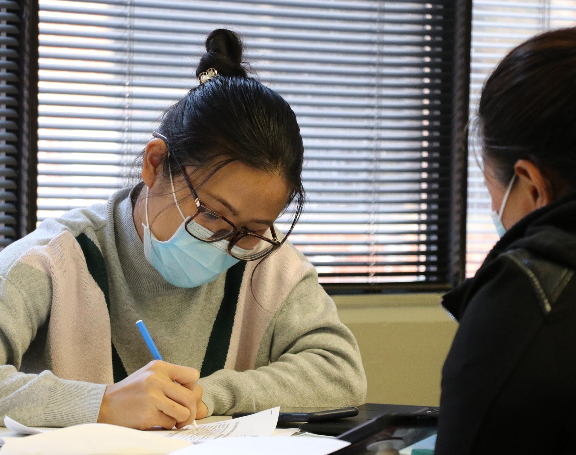 Crisis and Advocacy Program Coordinator Dim Muan Kim and volunteer Deb Timmons work together to assist a client with resource navigation.