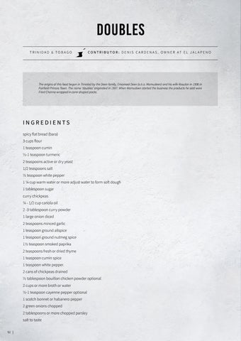 INGREDIENTS spicy flat bread (bara) 3 cups flour 1 teaspoon cumin ½-1 teaspoon turmeric 2 teaspoons active or dry yeast 1/2 teaspoons salt ½ teaspoon white pepper 1 ¼ cup warm water or more adjust water to form soft dough 1 tablespoon sugar curry chickpeas ¼ - 1/2 cup canola oil 2 -3 tablespoon curry powder 1 large onion diced 2 teaspoons minced garlic 1 teaspoon ground allspice 1 teaspoon ground nutmeg spice 1½ teaspoon smoked paprika 2 teaspoons fresh or dried thyme 1 teaspoon cumin spice 1 teaspoon white pepper. 2 cans of chickpeas drained ½ tablespoon bouillon chicken powder optional 2 cups or more broth or water ½-1 teaspoon cayenne pepper optional 1 scotch bonnet or habanero pepper 2 green onions chopped 2 tablespoons or more chopped parsley salt to taste 92 |