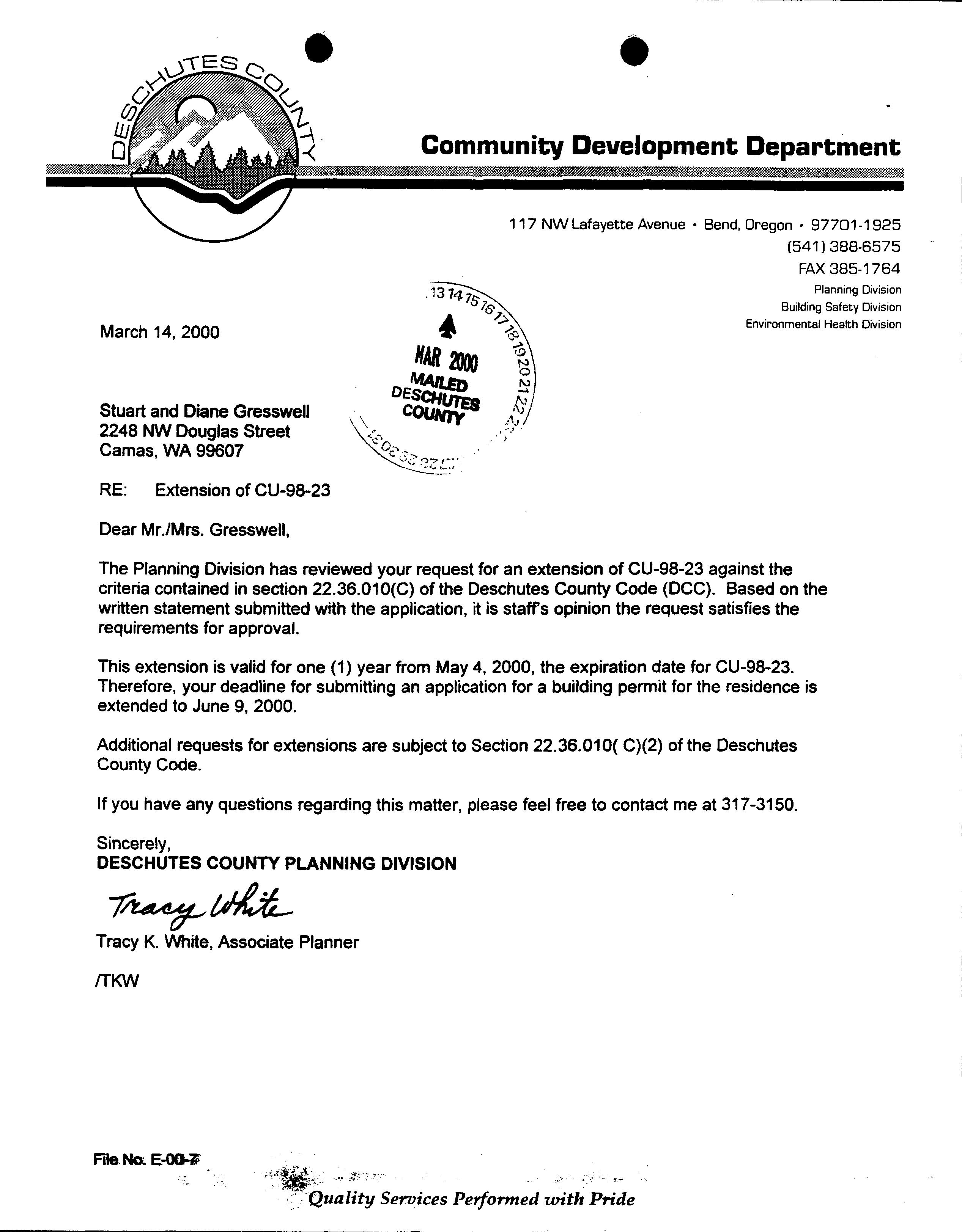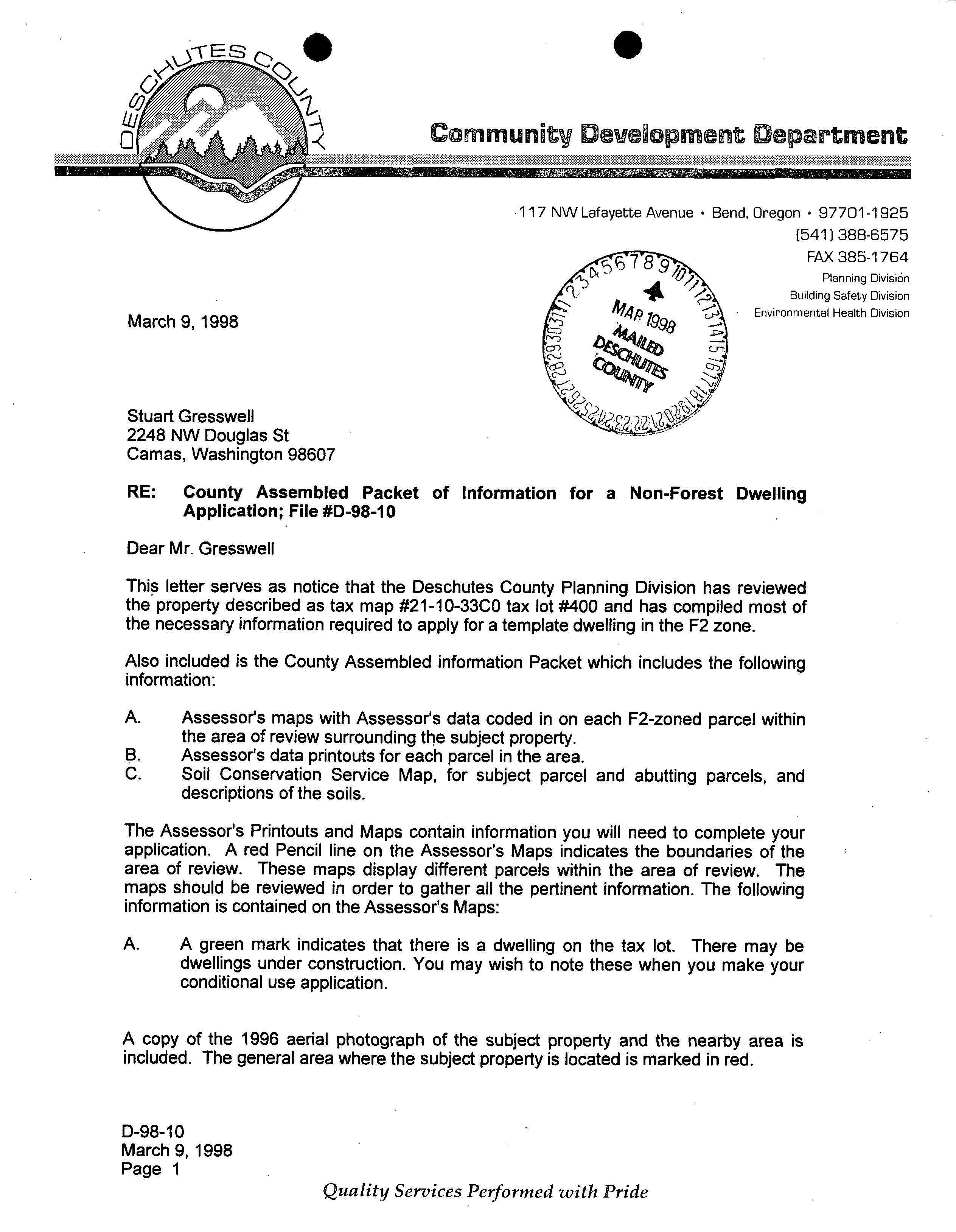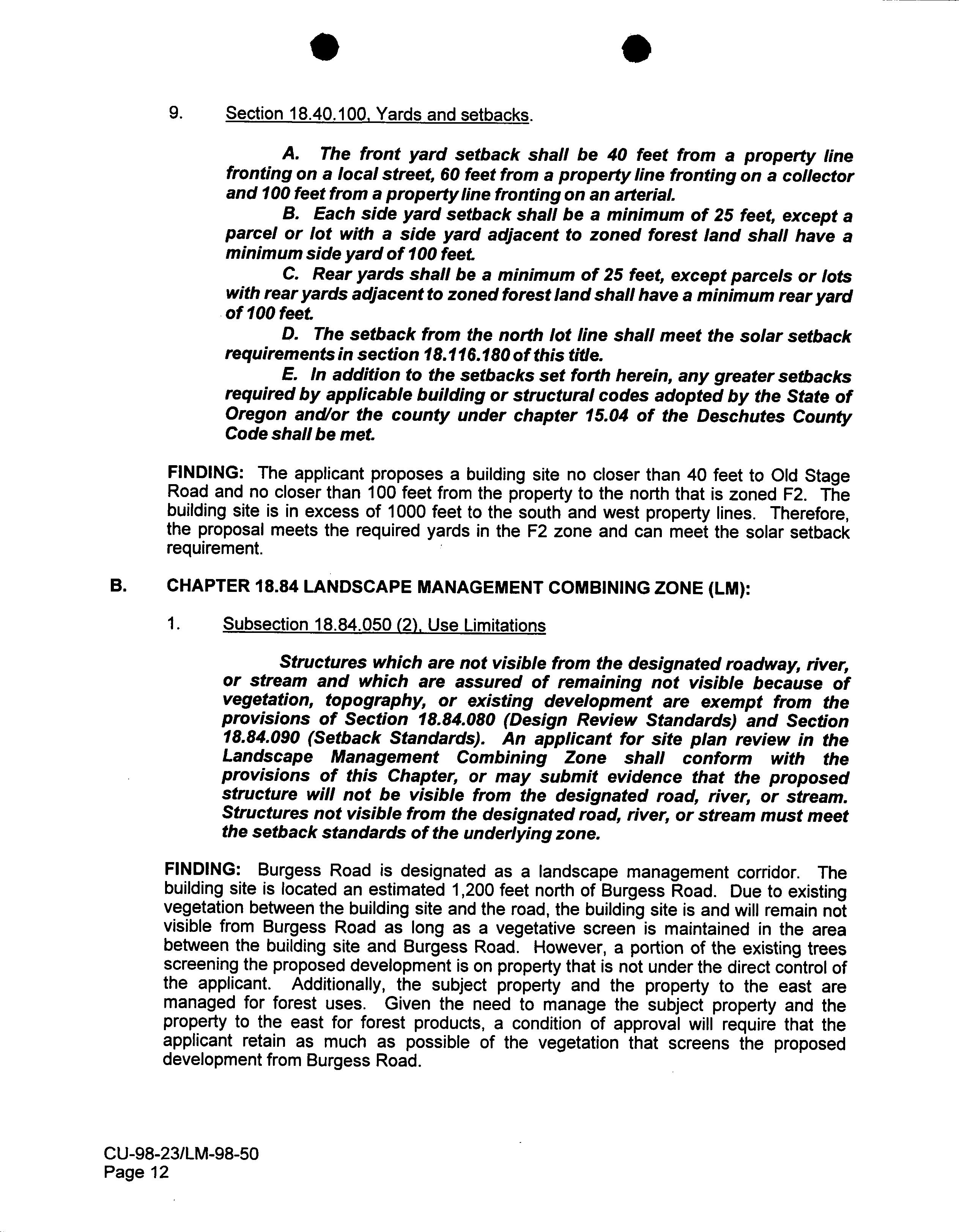 I ", A R: Deschutes CountyDepartmentofPublic Works willnottake responsibility for ensuring that all otherconditions ofanyotherregulating agency have been complied with. Itisthe responsibility ofthe homeowner to meet subdivision Covenants, Conditions and Restrictions ( C.CR.'s) and all other neighborhood and regulatory agenoy requirements.