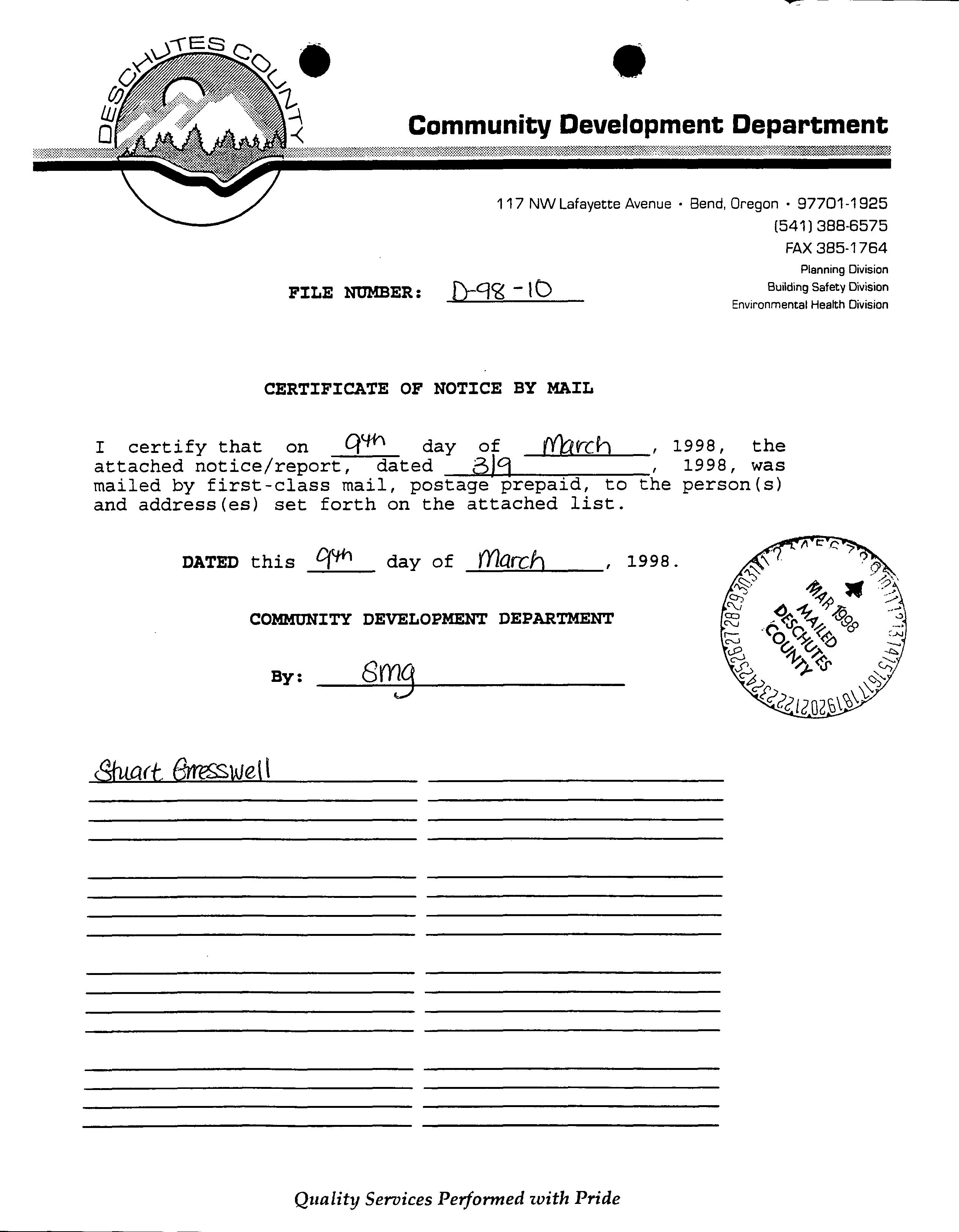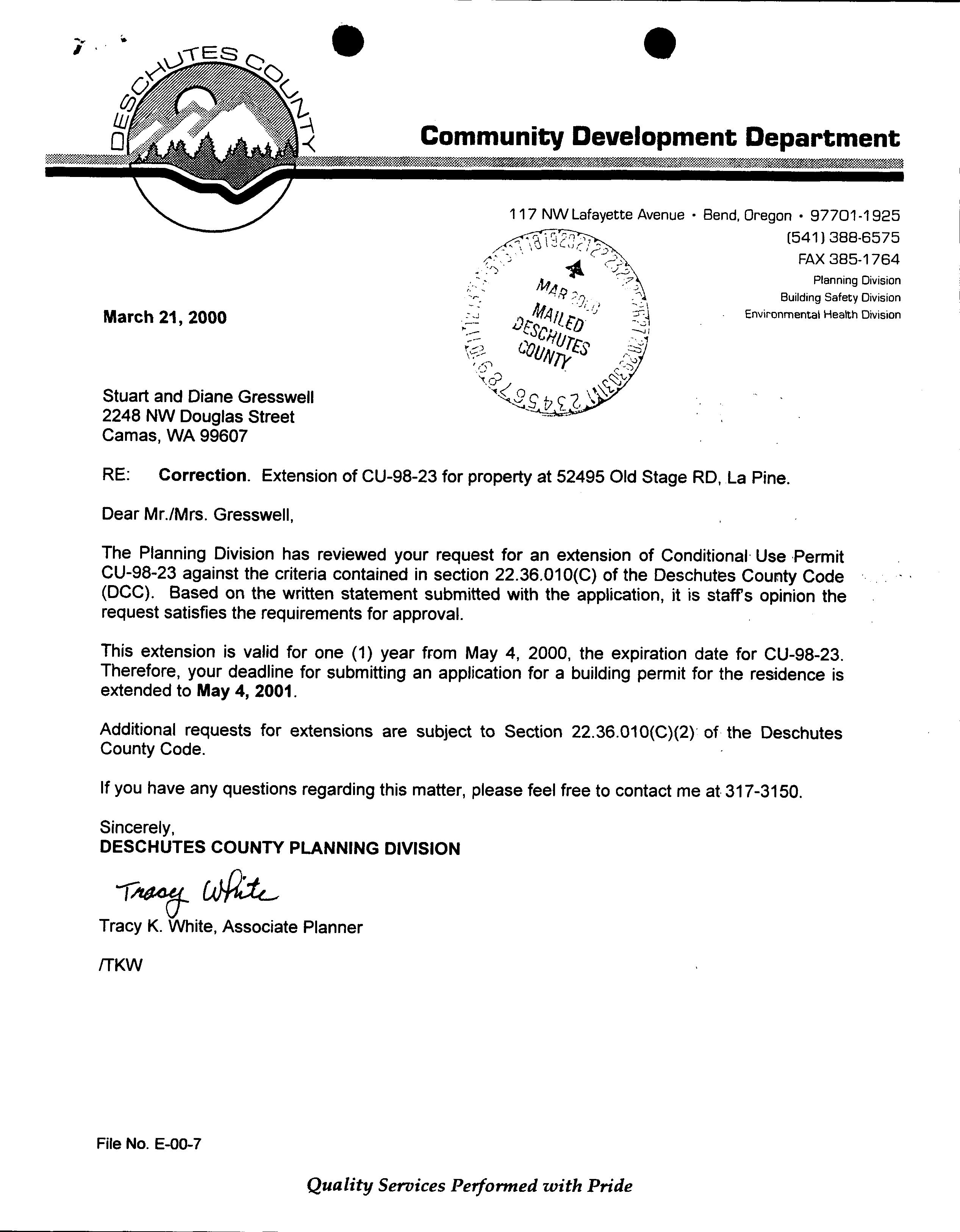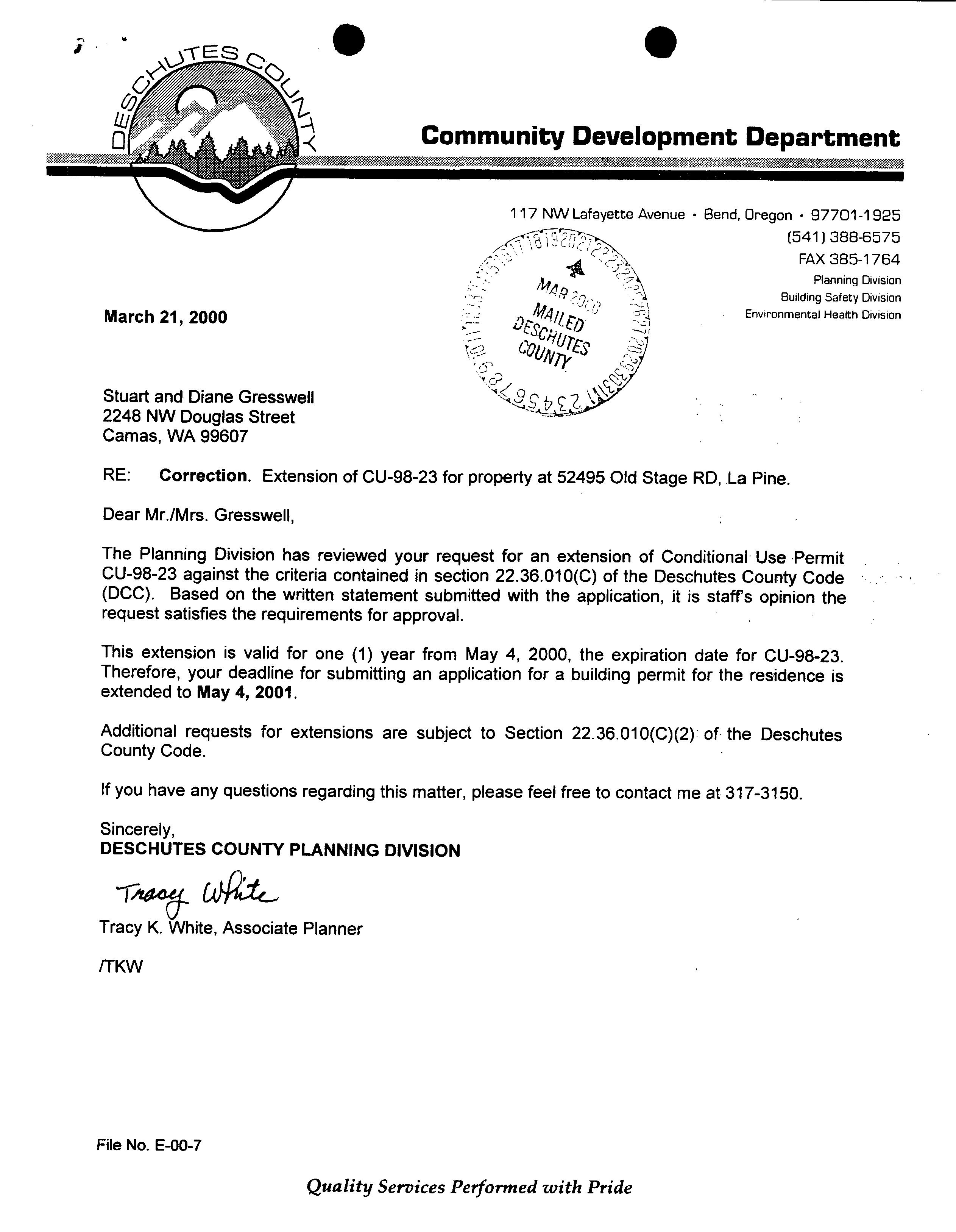 I ", A R: Deschutes CountyDepartmentofPublic Works willnottake responsibility for ensuring that all otherconditions ofanyotherregulating agency have been complied with. Itisthe responsibility ofthe homeowner to meet subdivision Covenants, Conditions and Restrictions ( C.CR.'s) and all other neighborhood and regulatory agenoy requirements.