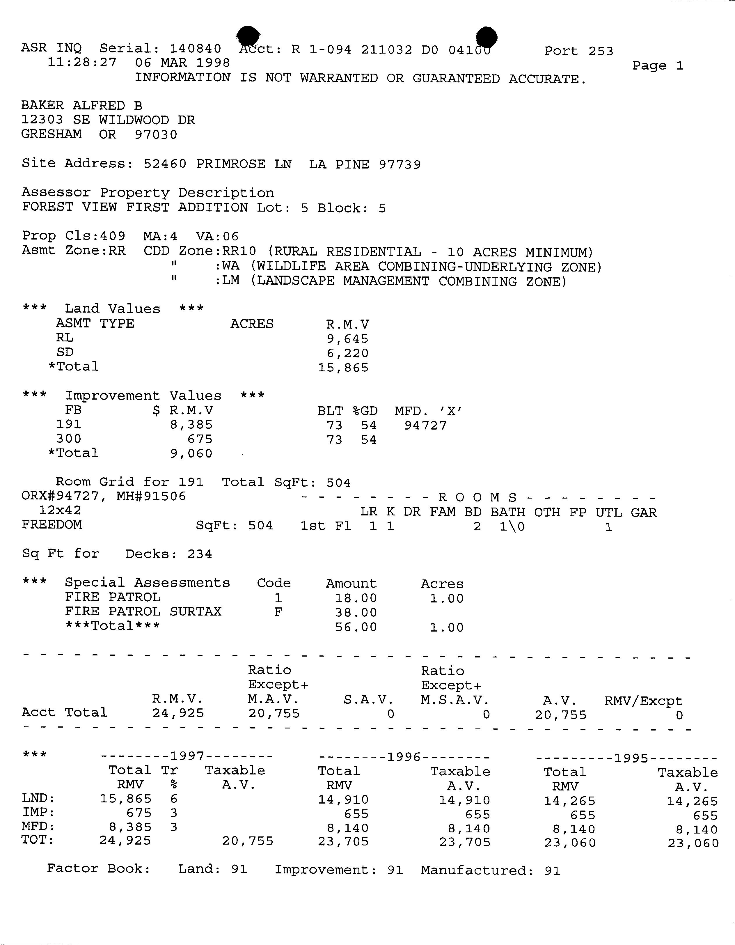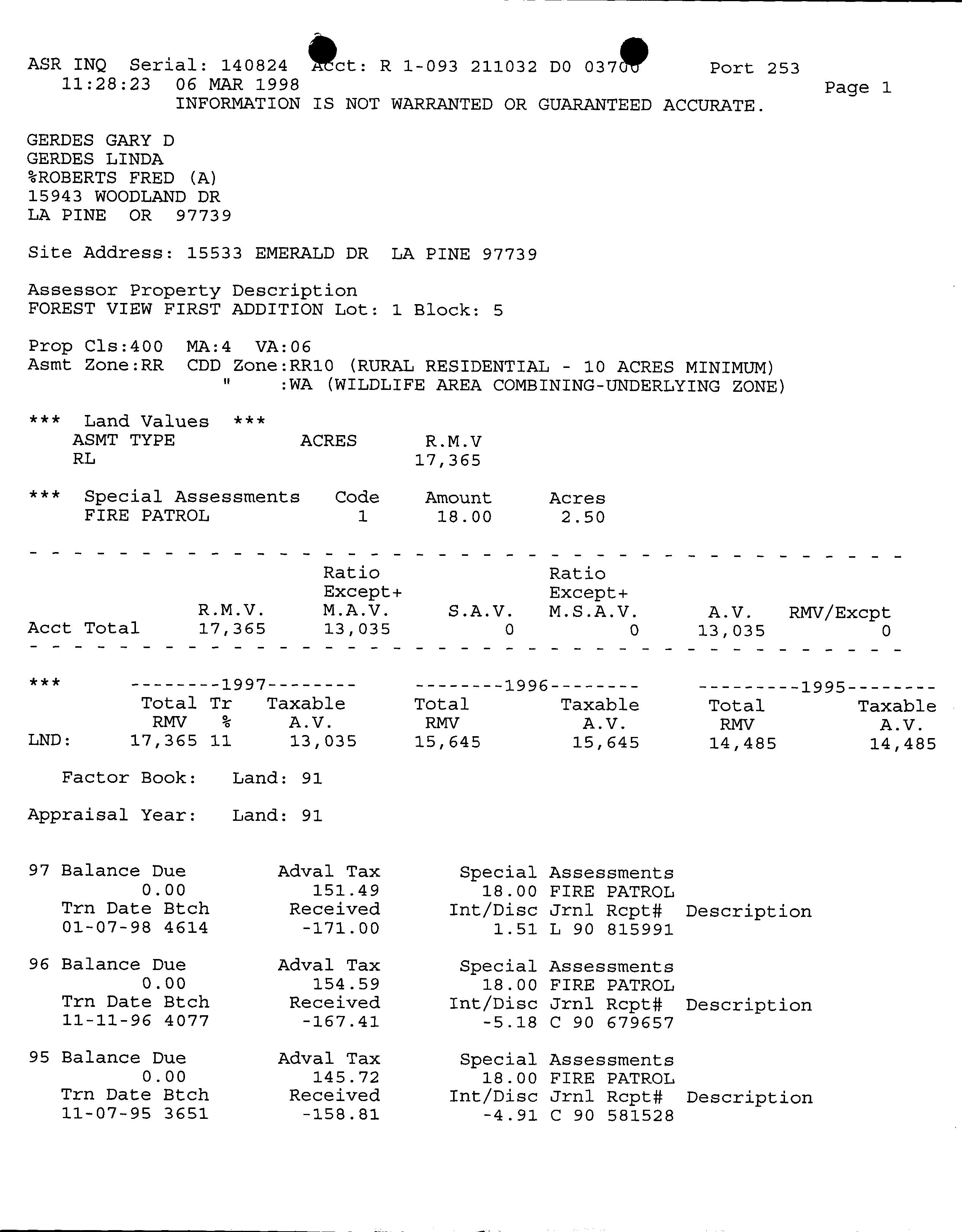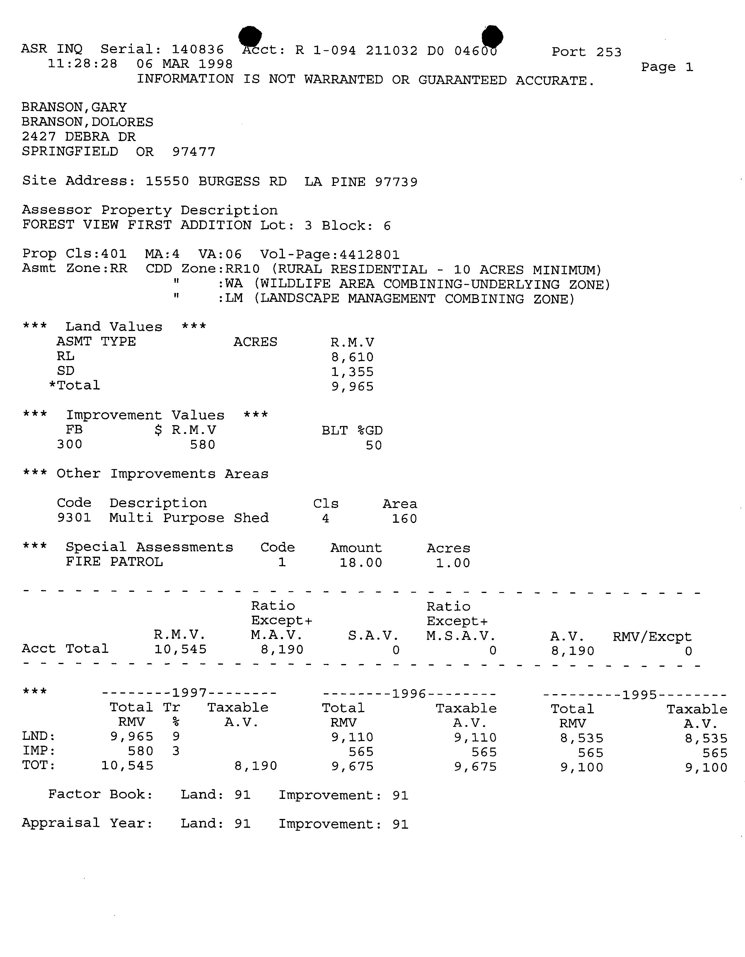 04/10/1998 LEL GC OLD SITUS= 15660 BURGESS RD,LA PINE 03/16/1998 TMT THIS IS A 37 ACRE PARCEL.