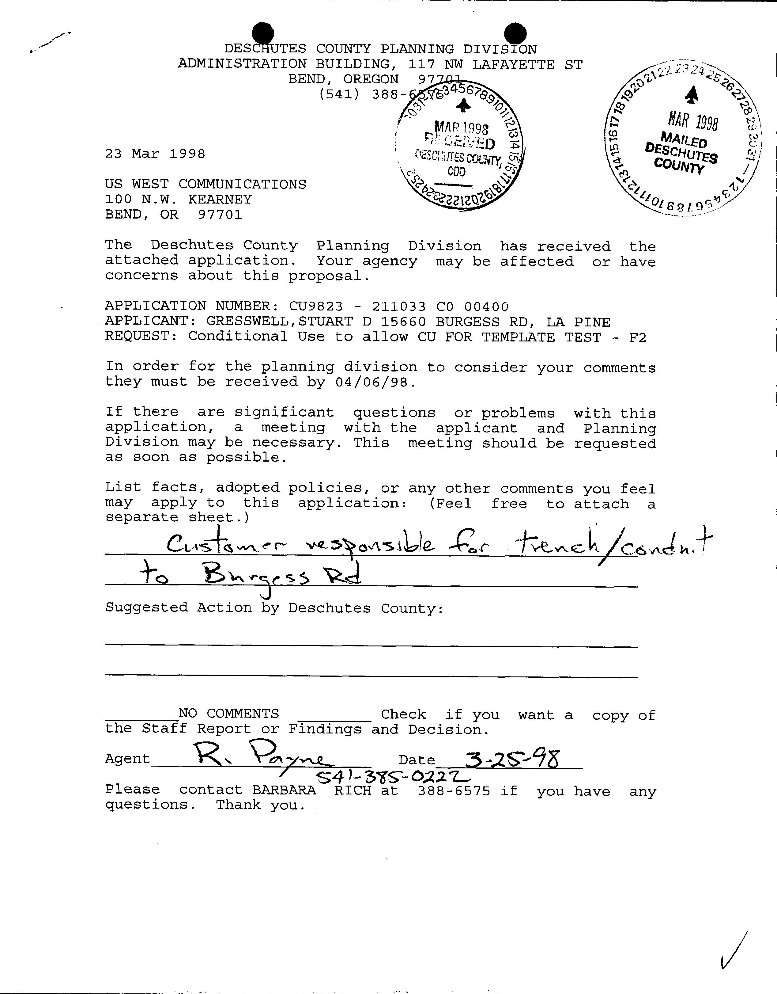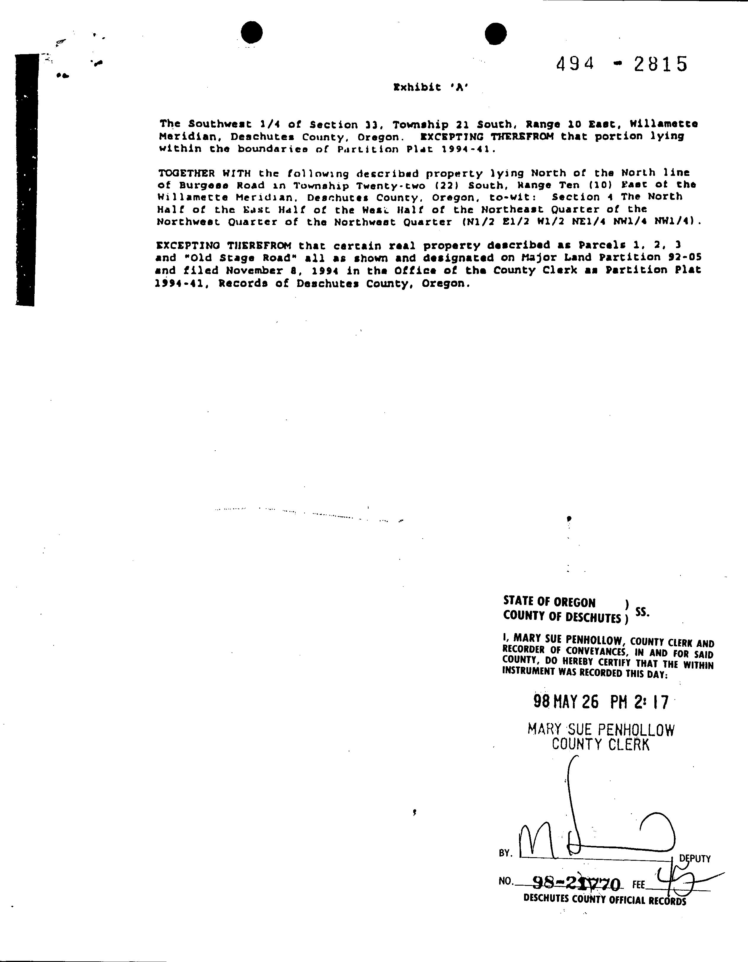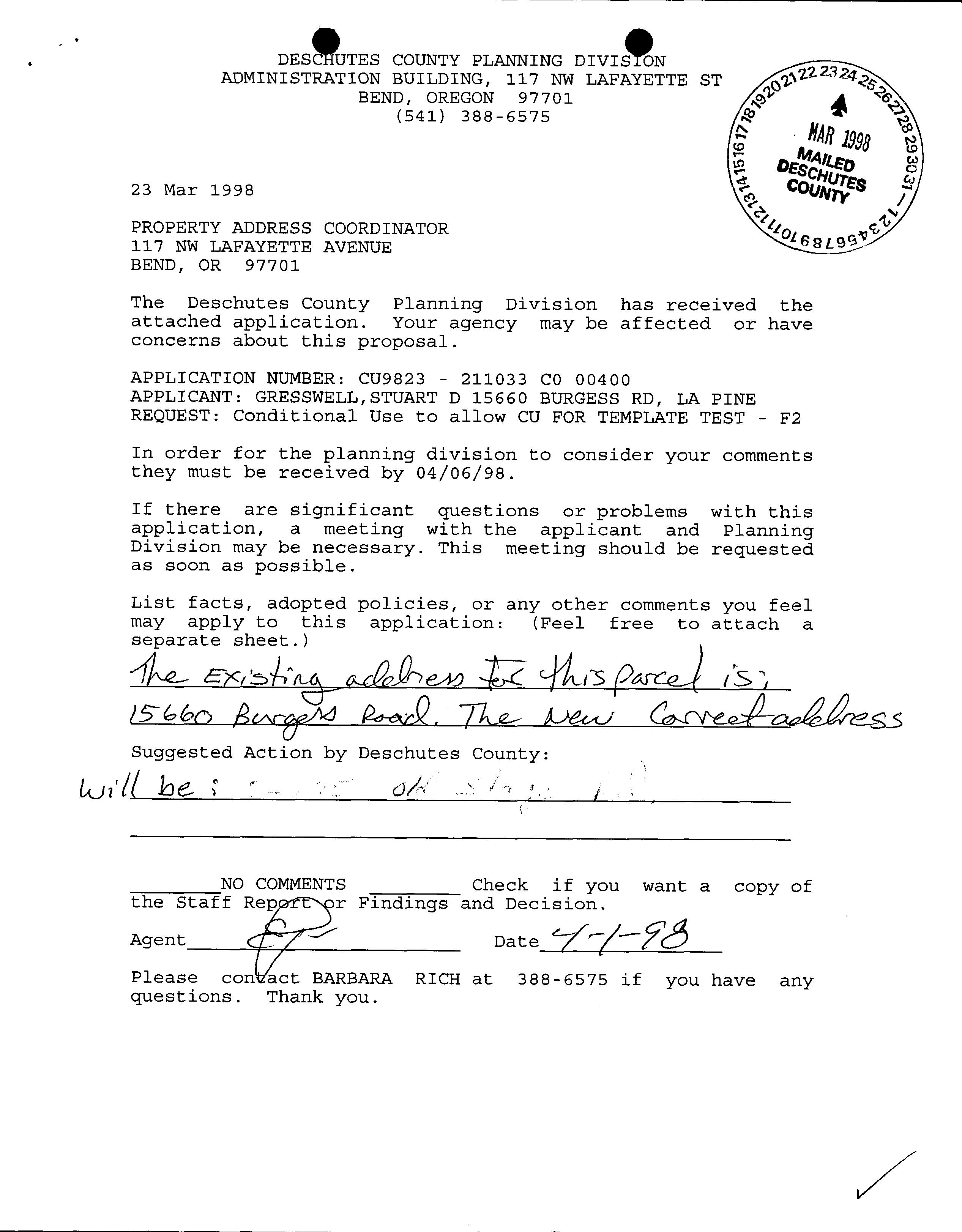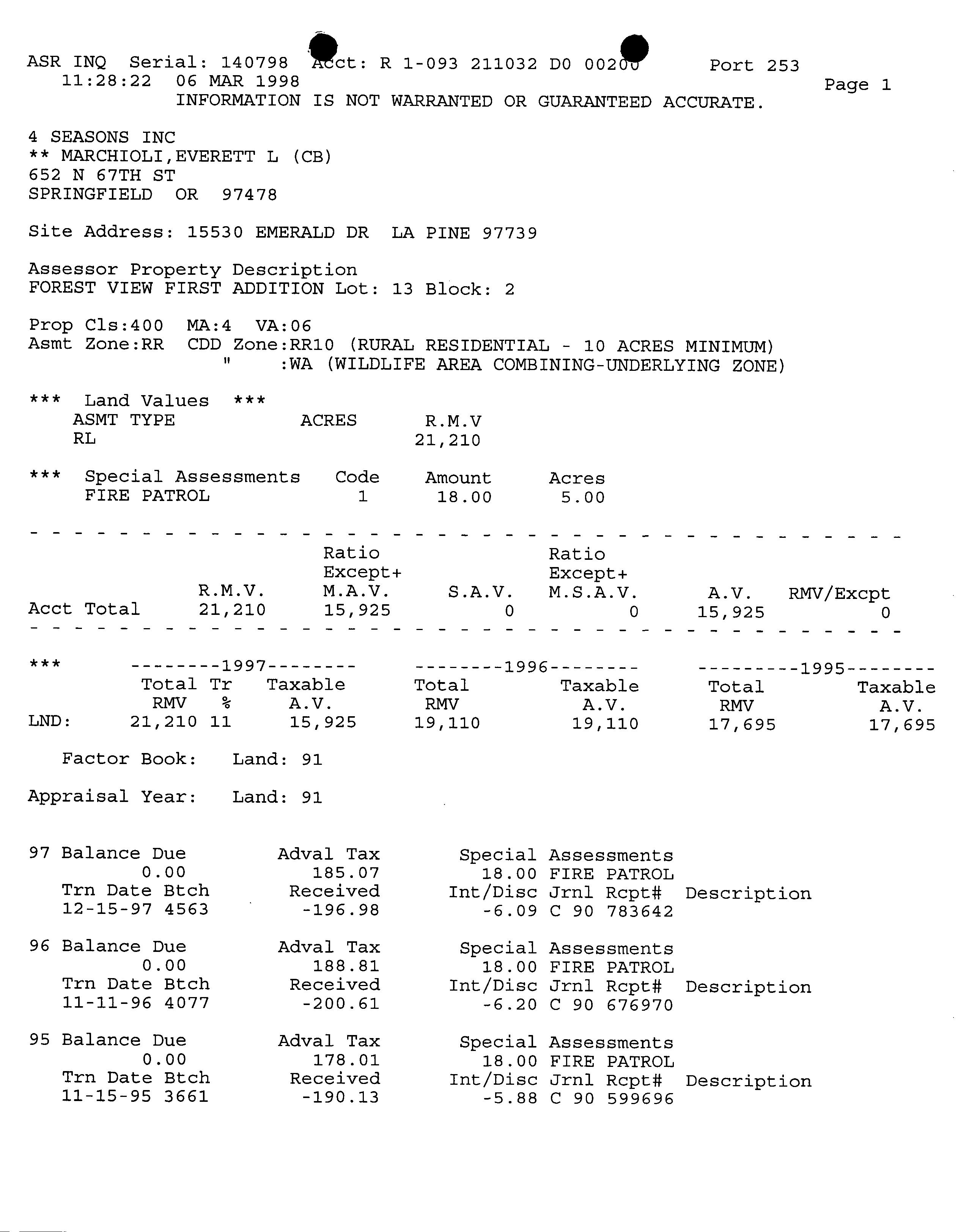 04/10/1998 LEL GC OLD SITUS= 15660 BURGESS RD,LA PINE 03/16/1998 TMT THIS IS A 37 ACRE PARCEL.