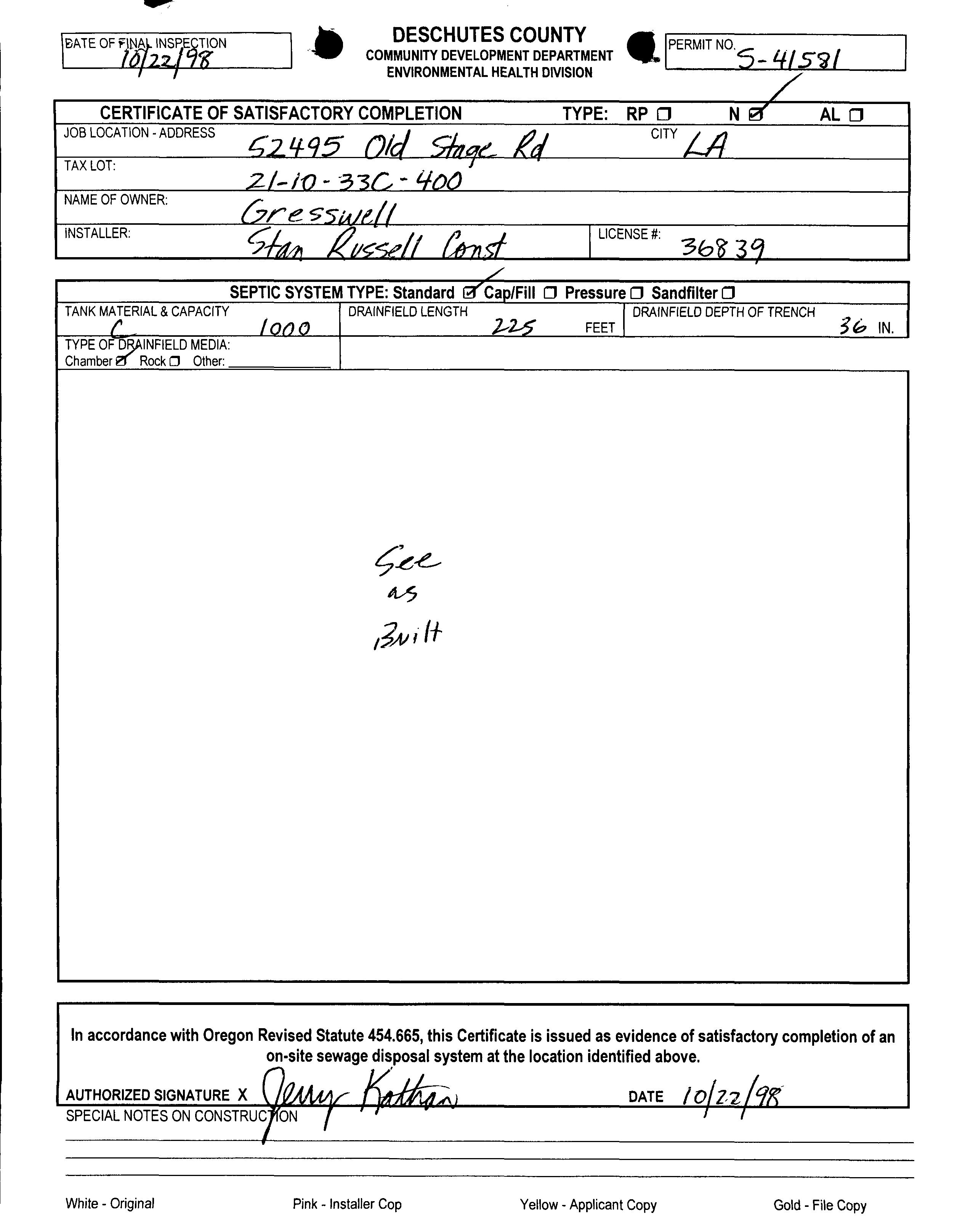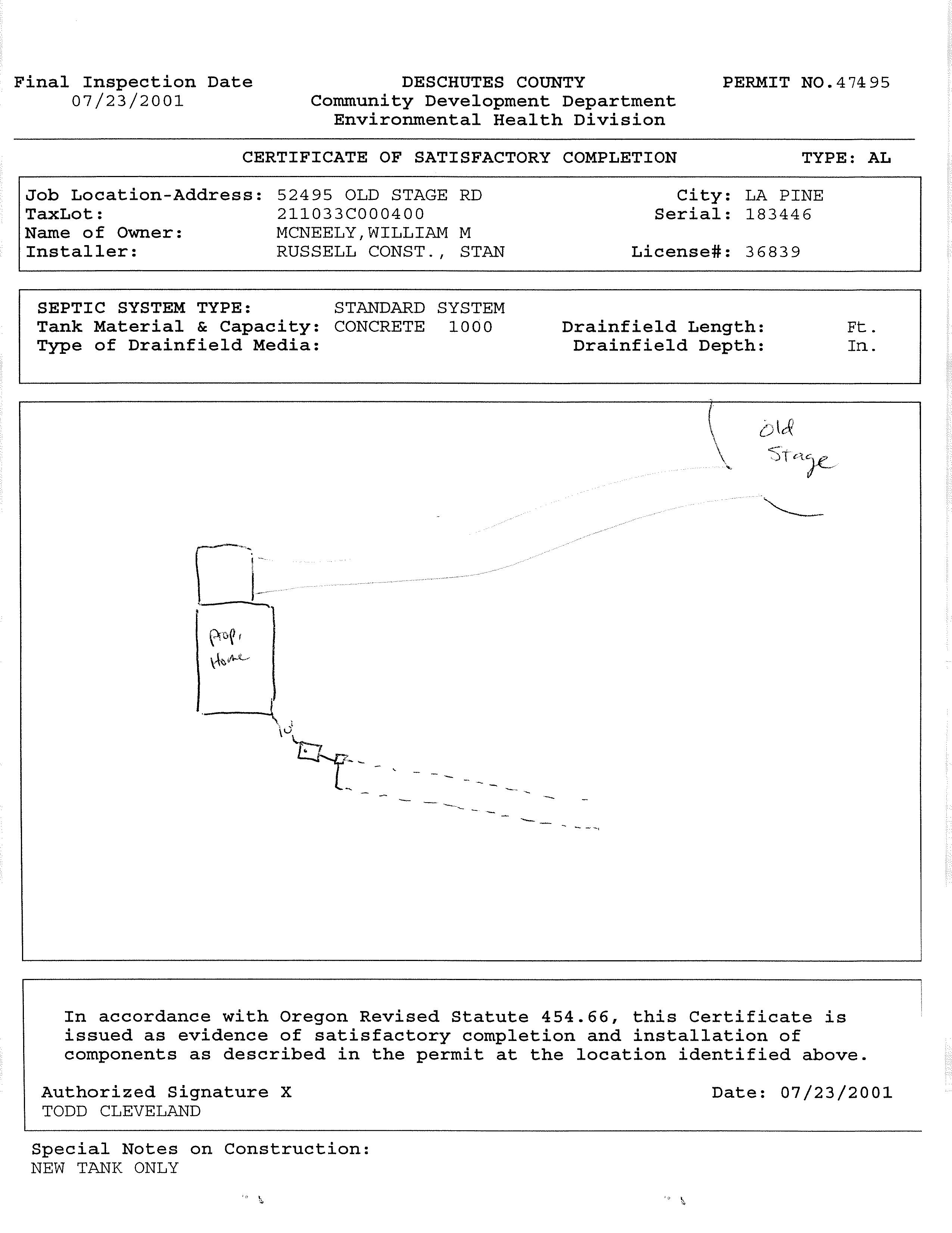 In accordance with Oregon Revised Statute 454. 66, this Certificate is issued as evidence of satisfactory completion and installation of components as described in the permit at the location identified above.