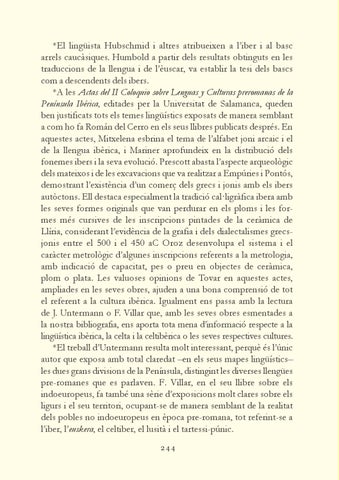 *El lingüista Hubschmid i altres atribueixen a l’iber i al basc arrels caucàsiques. Humbold a partir dels resultats obtinguts en les traduccions de la llengua i de l’èuscar, va establir la tesi dels bascs com a descendents dels ibers. *A les Actas del II Coloquio sobre Lenguas y Culturas preromanas de la Península Ibérica, editades per la Universitat de Salamanca, queden ben justificats tots els temes lingüístics exposats de manera semblant a com ho fa Román del Cerro en els seus llibres publicats després. En aquestes actes, Mitxelena esbrina el tema de l’alfabet joni arcaic i el de la llengua ibèrica, i Mariner aprofundeix en la distribució dels fonemes ibers i la seva evolució. Prescott abasta l’aspecte arqueològic dels mateixos i de les excavacions que va realitzar a Empúries i Pontós, demostrant l’existència d’un comerç dels grecs i jonis amb els ibers autòctons. Ell destaca especialment la tradició cal·ligràfica ibera amb les seves formes originals que van perdurar en els ploms i les formes més cursives de les inscripcions pintades de la ceràmica de Llíria, considerant l’evidència de la grafia i dels dialectalismes grecsjonis entre el 500 i el 450 aC Oroz desenvolupa el sistema i el caràcter metrològic d’algunes inscripcions referents a la metrologia, amb indicació de capacitat, pes o preu en objectes de ceràmica, plom o plata. Les valuoses opinions de Tovar en aquestes actes, ampliades en les seves obres, ajuden a una bona comprensió de tot el referent a la cultura ibèrica. Igualment ens passa amb la lectura de J. Untermann o F. Villar que, amb les seves obres esmentades a la nostra bibliografia, ens aporta tota mena d’informació respecte a la lingüística ibèrica, la celta i la celtibèrica o les seves respectives cultures. *El treball d’Untermann resulta molt interessant, perquè és l’únic autor que exposa amb total claredat –en els seus mapes lingüístics– les dues grans divisions de la Península, distingint les diverses llengües pre-romanes que es parlaven. F. Villar, en el seu llibre sobre els indoeuropeus, fa també una sèrie d’exposicions molt clares sobre els ligurs i el seu territori, ocupant-se de manera semblant de la realitat dels pobles no indoeuropeus en època pre-romana, tot referint-se a l’iber, l’euskera, el celtiber, el lusità i el tartessi-púnic. 244