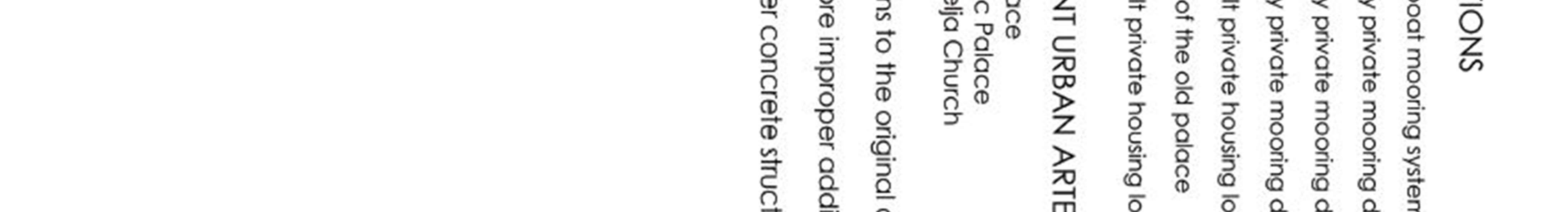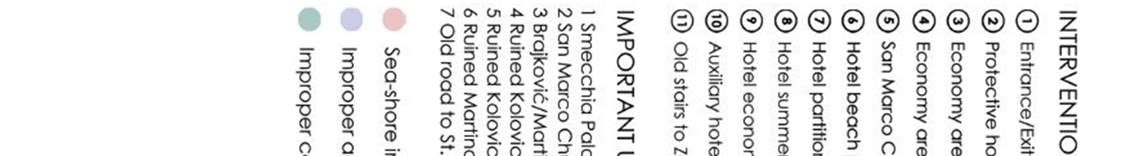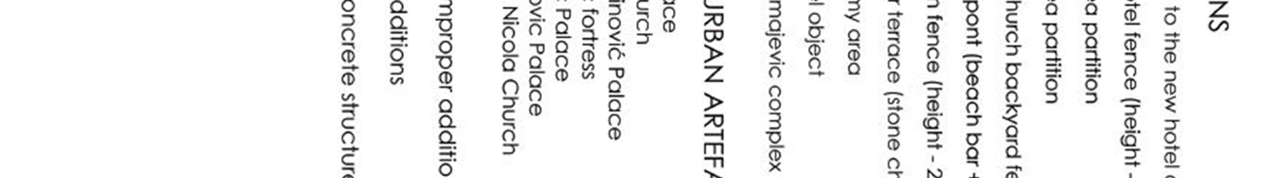 large number of points in the city that are not directed towards an individual building but towards the panorama of the city,aninterestingarchitecturalgroup,aroundedambience,eithernaturalorbuilt.Suchplacesarethemostnumerous and refer to micro-ambiences, individual motifs (loophole, beautiful tree, flower ensemble, street extension) or views towards the natural environment (towards Lovćen, Orjen and Veriga). Of particular importance is a group of views of buildingswhosephysicalcharacteristics disrupttheharmoniousimageofthecityorurbanenvironment.This mayrefer to the building as a whole (factory hall "Jadrana", modern house on parcel 107 KOPerast) or, more often, to some extension or detail (facade treatment, position and proportions as well as the shape of the windowor visions, balcony, fence, etc.). There are quite a number of buildings that have some architectural and / or ambient negativity. Finally, it shouldbeaddedthatthecablenetwork(overheadelectricalnetwork)intheentirecitydisruptstheperceptionofspatial sequences and images of the city.