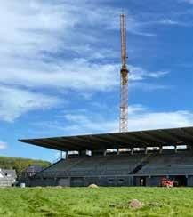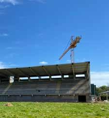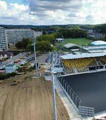 chantier. « Nous avons construit deux citernes d’eau communicantes, d’environ 50 m³ chacune, en-dessous des deux extensions des tribunes. Grâce à un système de drains sous le terrain et un nouvel égouttage, l’eau de pluie arrive dans ces citernes, via une chambre de relevage, et alimente les 8 arroseurs situés de part et d’autre de la surface de jeu, qui doit régulièrement être arrosée pendant les rencontres. Cela donne une touche « économie circulaire » à ce projet », poursuit le conducteur de chantier. « Nous avons également refait la toiture de la tribune et aménagé un système de récupération des eaux pluviales (pluvia), qui part de la toiture, traverse l’intégralité du bâtiment pour finalement être rejetée dans les citernes et ainsi permettre de les alimenter. »
