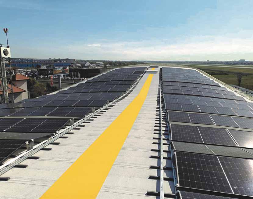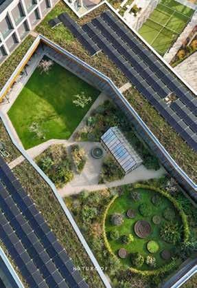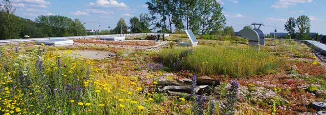 Bovenop de kantoorgebouwen die de daktuin omzomen, werden sedumdaken aangelegd in combinatie met zonnepanelen die niet zichtbaar zijn vanop de daktuin.