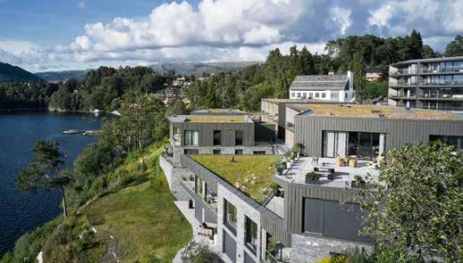 noordzijde is zelfs twee lagen hoger. Zo ontstaat een ingekuipte daktuin die niet alleen beschermd is tegen de wind, maar waar ook het geluid van de nabijgelegen snelweg volledig wordt tegengehouden.