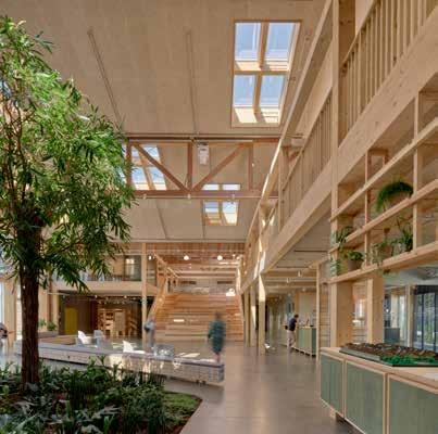 VELUX souhaitait également que les bâtiments en bois s'intègrent harmonieusement dans la nature environnante. Bien entendu, il fallait réduire au maximum les émissions de CO₂, que le bâtiment soit économe en énergie et que les principes de circularité soient appliqués autant que possible.