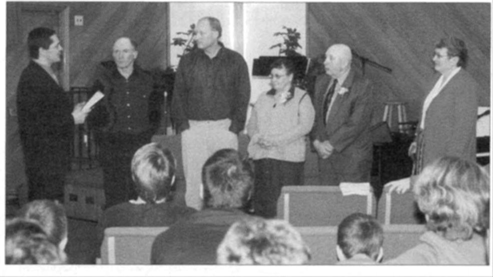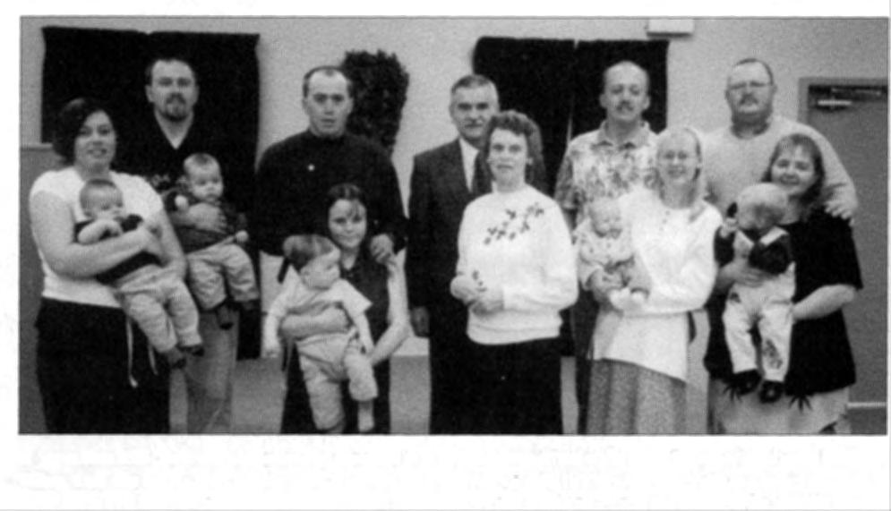 Five couples participated in this dedication. They were Corey and Joanne Dyck wilh Ezrd. Joe and Corrine Thiessen with Sm-\} er, Pat and Judy Martens with Kenley, Bev and Emery Plett with Macy, and Trevor and Cathy Schellenberg with Egan.