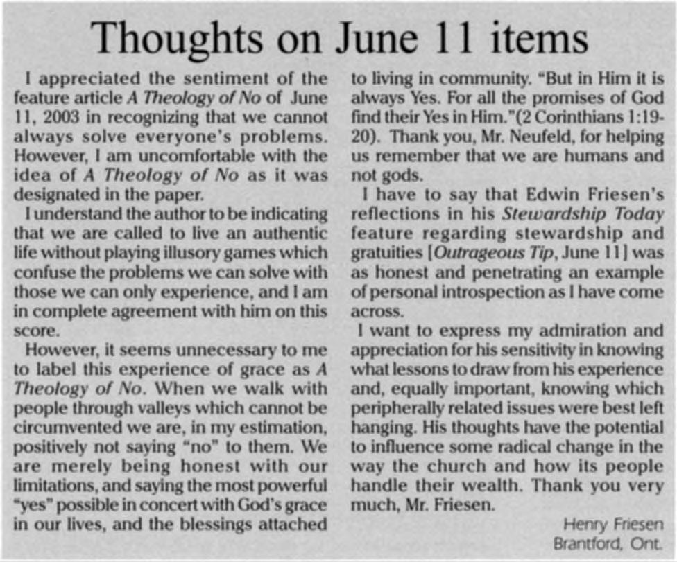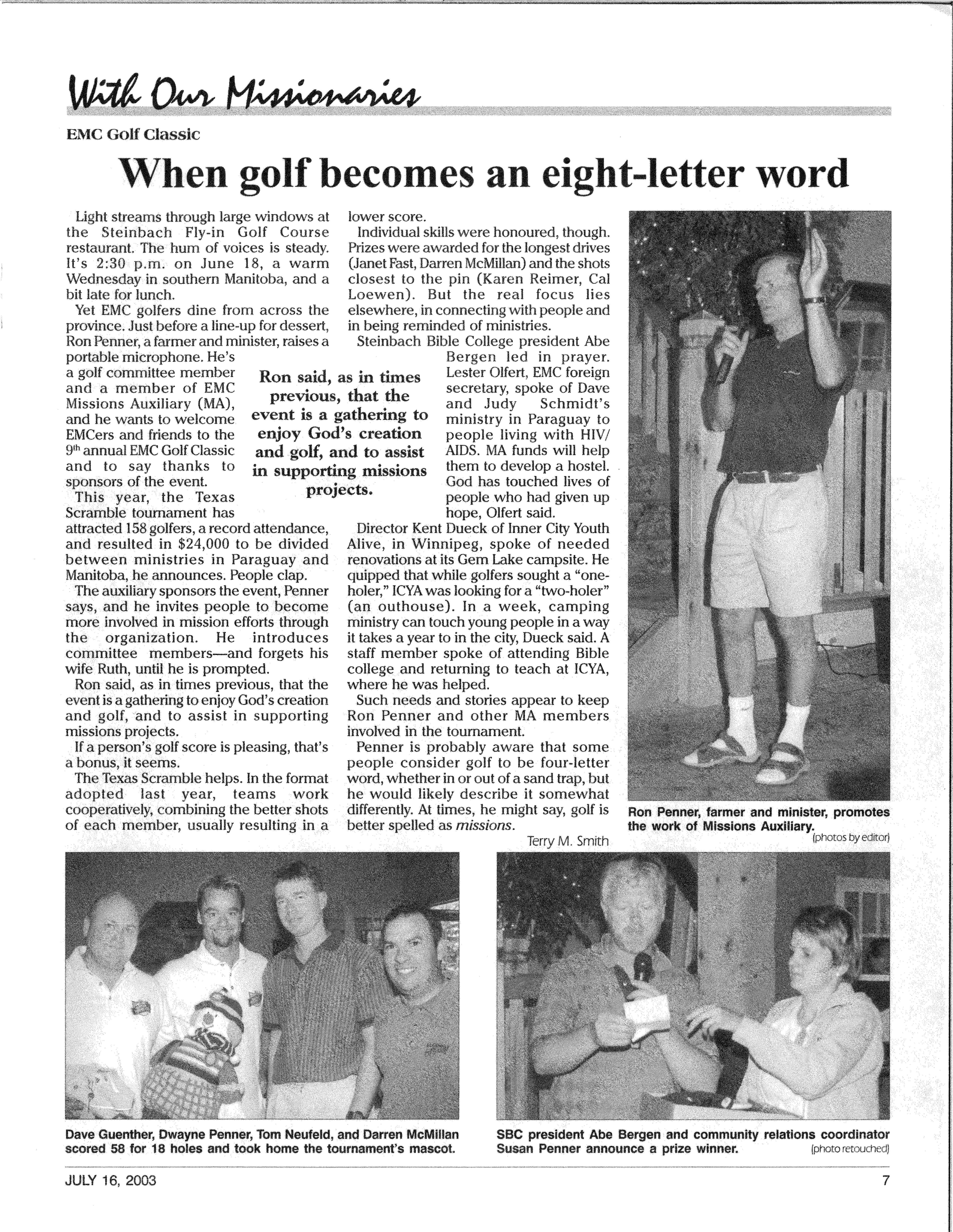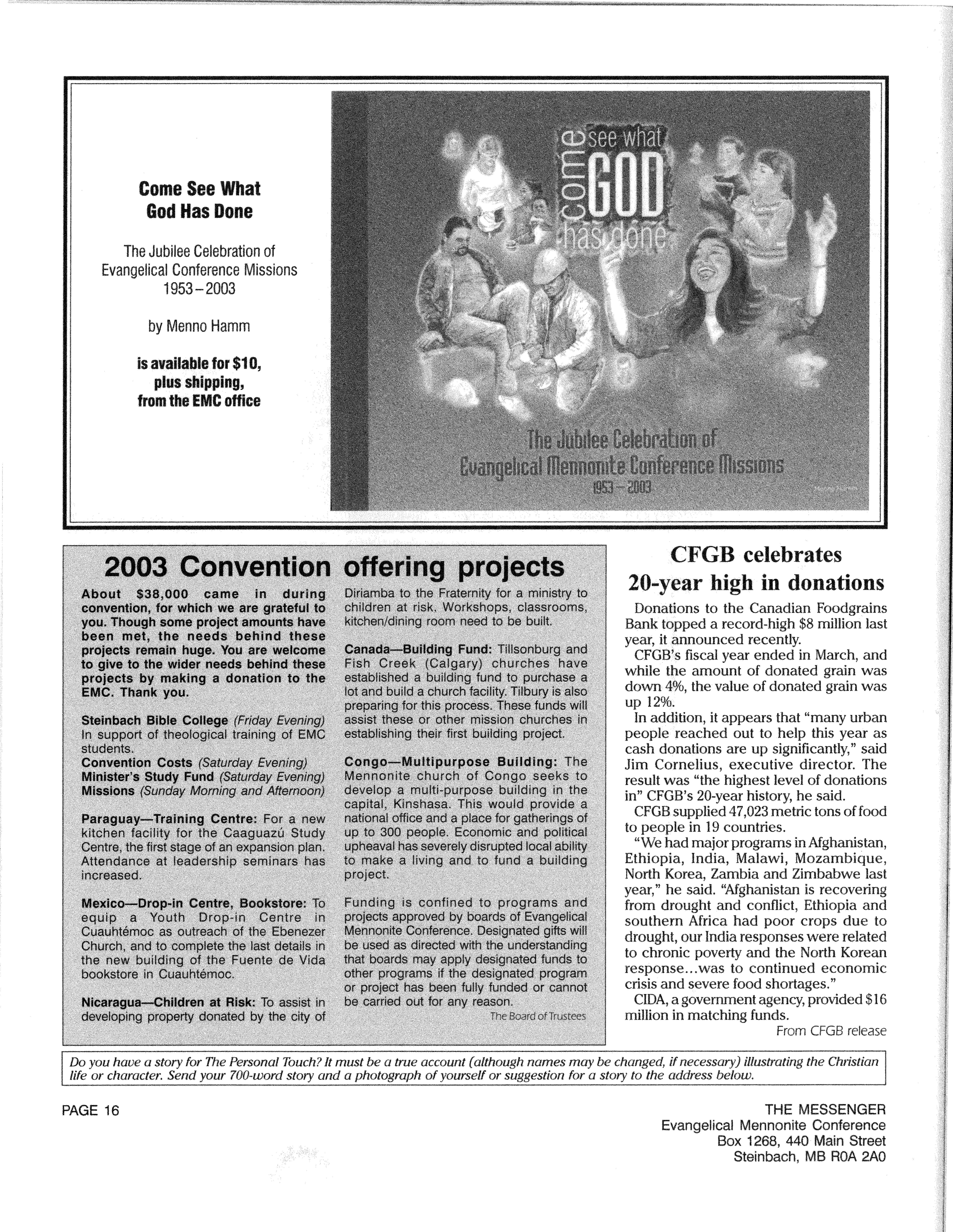 EVANGELICAL MENNONITE CONFERENCE ~fl VOLUME 41 NUMBER 13 JULY 16, 2003 -