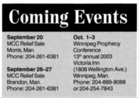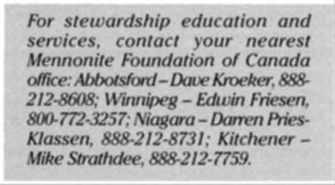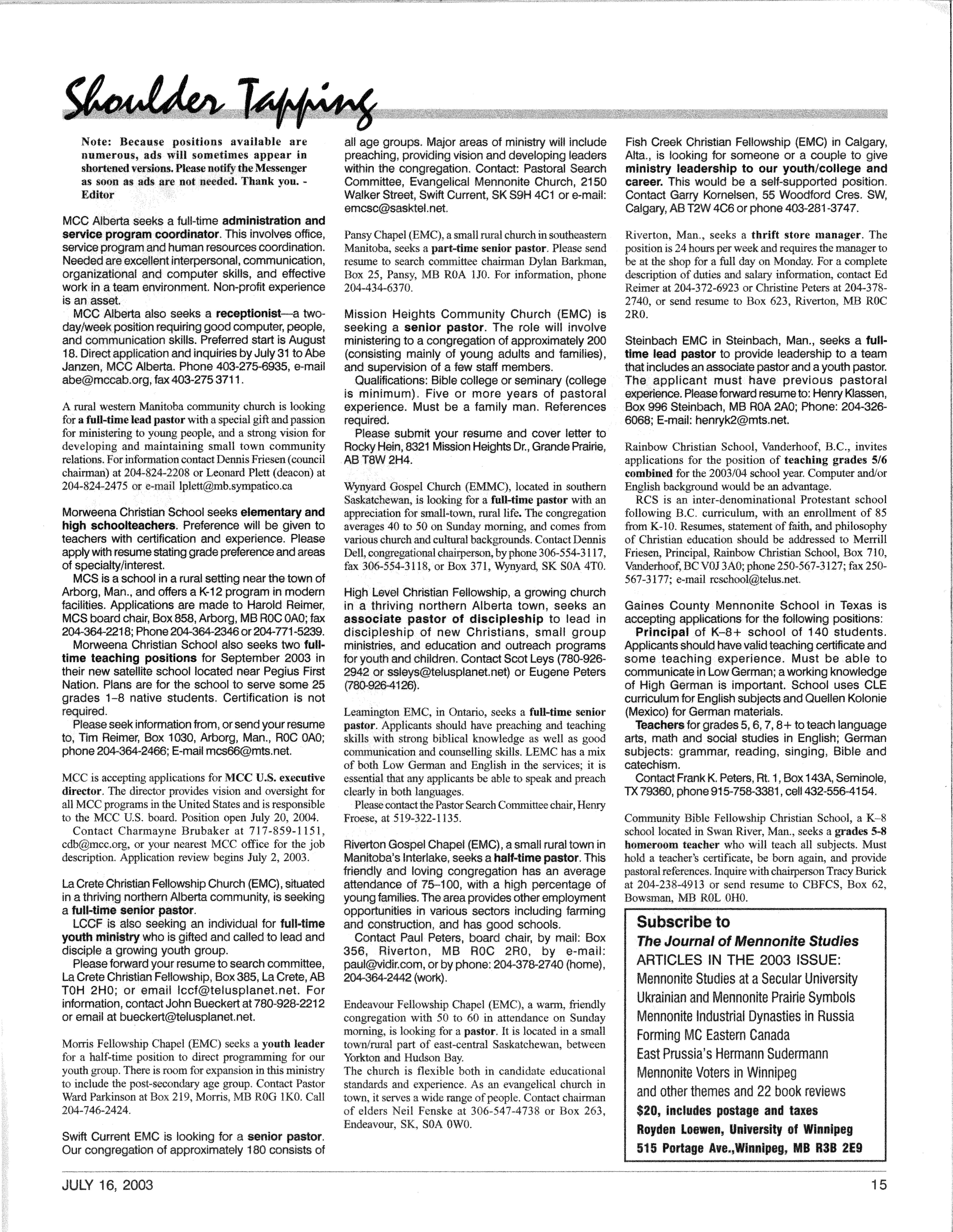 MCC Alberta also seeks a receptionist-a twoday/week position requiring good computer, people, and communication skills. Preferred start is August 18. Direct application and ,nquiries by July 31 to Abe Janzen, MCC Alberta. Phone 403-275-6935, e-mail abe@mocab.org tax 403-275 371 l.