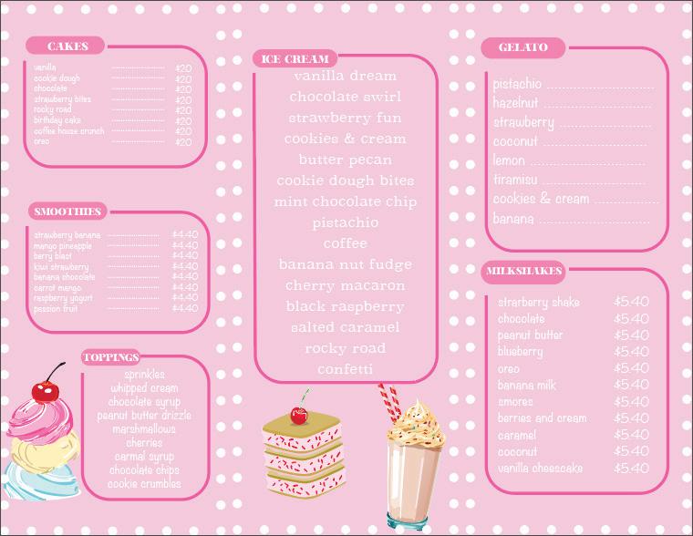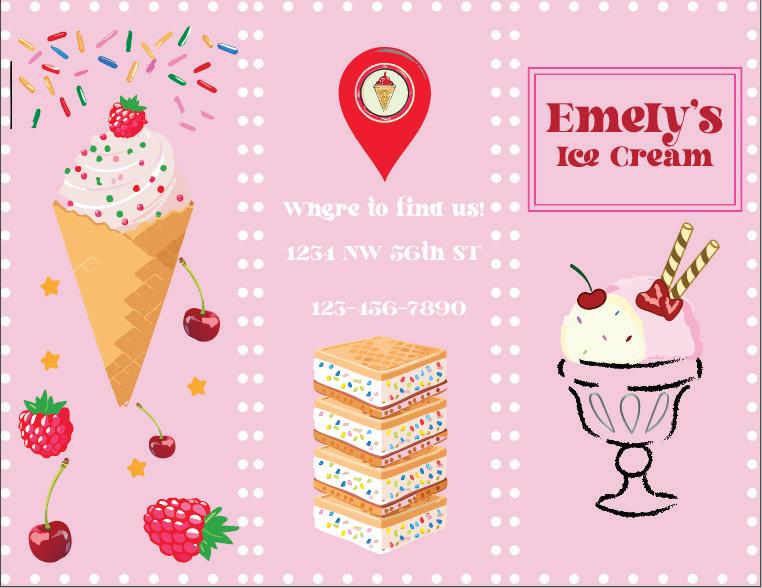 This assignment was an enjoy able project to work on. I start ed by creating my InDesign file and applying the margins and a background color. I then opened Illustrator to start on my shop s logo. My idea was an Ice Cream shop and I wanted the logo to be somewhat hand drawn. I used the pencil tool and brush tool to create the el ements of my logo such as the cup, the ice cream scoops and the toppings.
