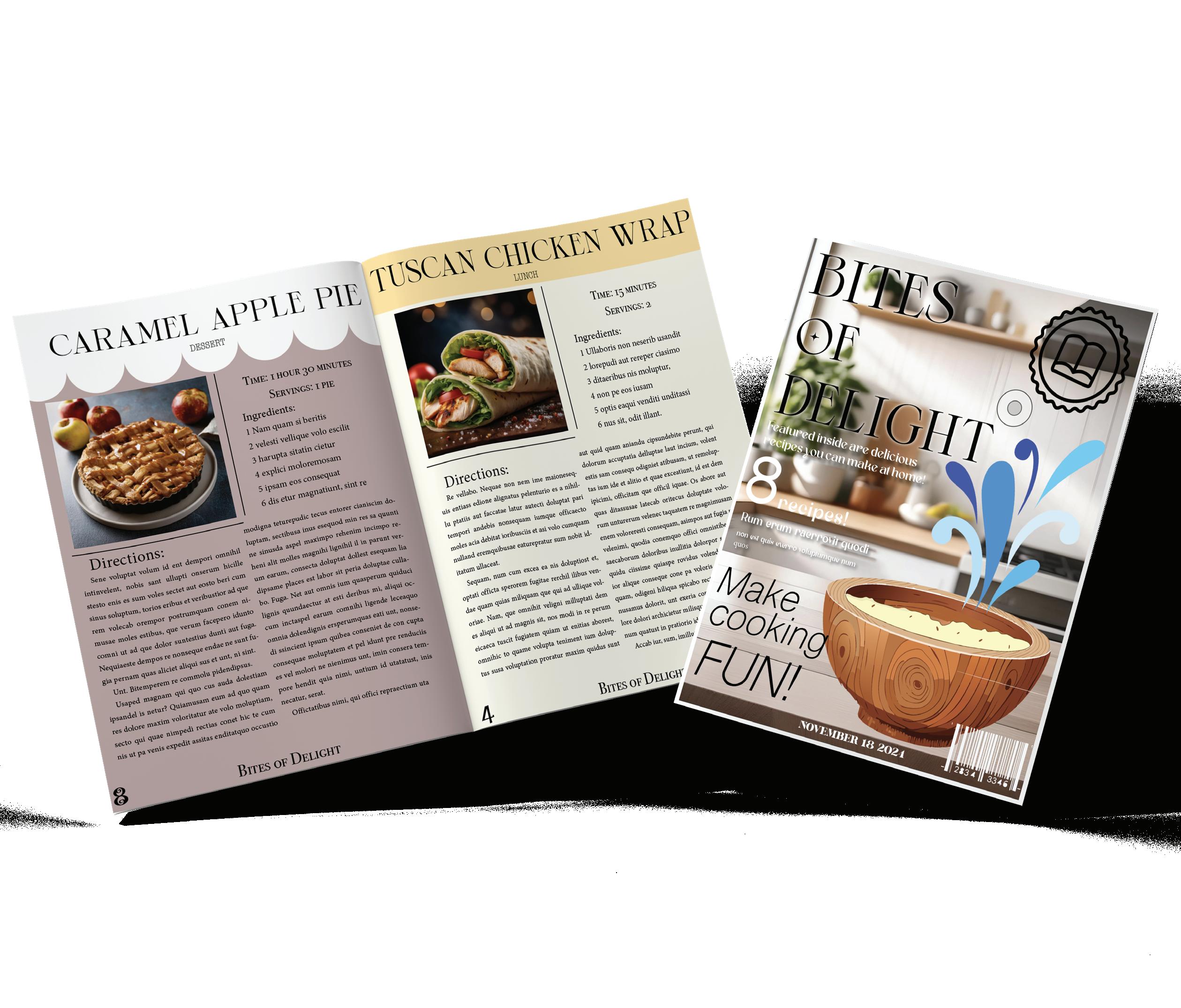 parents pages on InDesign and moving onto creating the layout for each one. The two sections for this cook book were Lunch and Dessert. I created different page formats to keep it pleasing for viewers. For the cover, I created the logo with the pen tool and used the AI Generator to create the wooden bowl. When designing the actual recipe pages, I once again used Ai to create the images for the food. As for the text, I added placeholder text and used tracking and leading tools to get it to that final result.