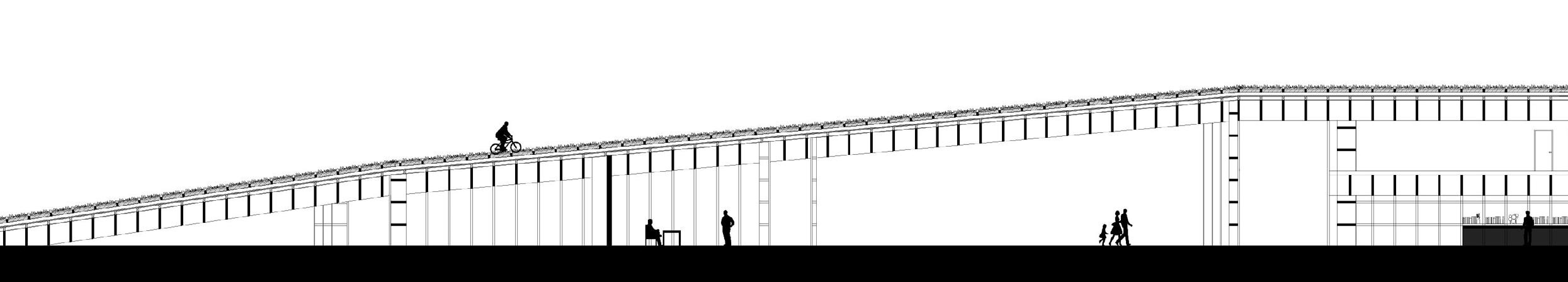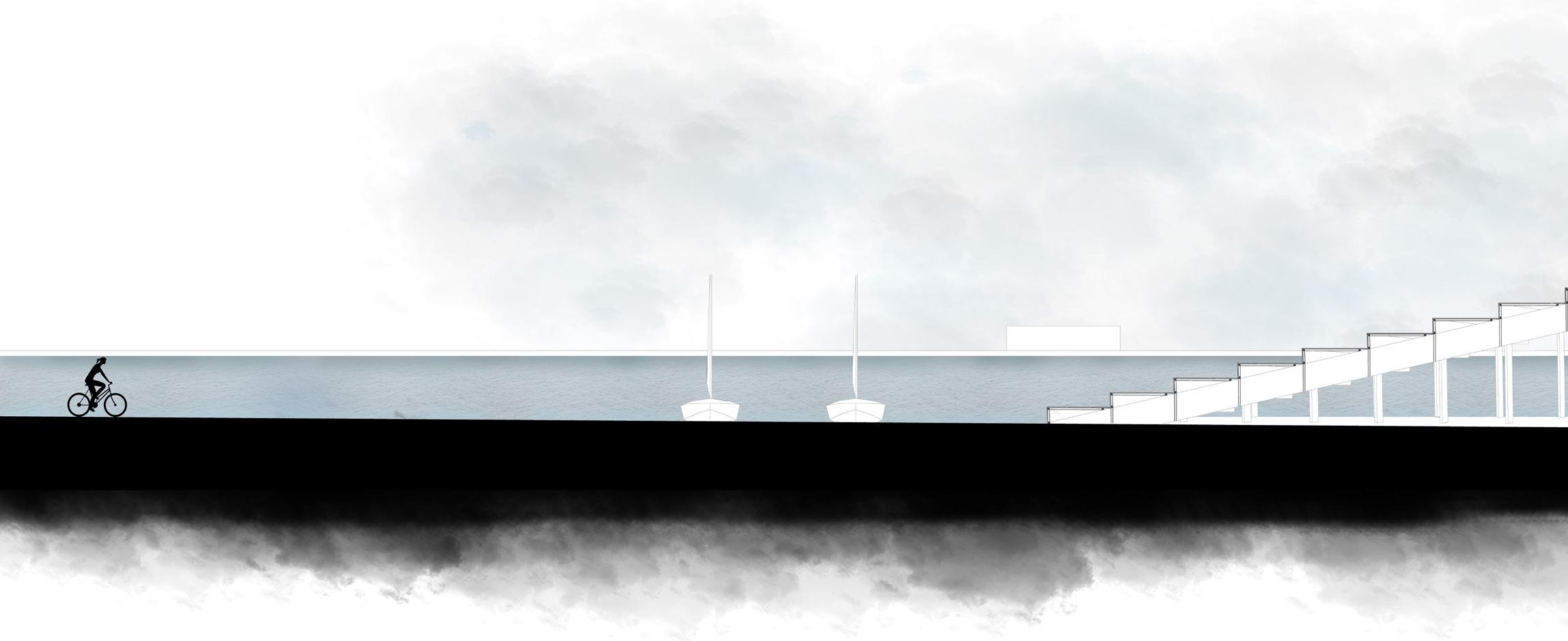 My proposal was to give a new relief in the flat landscape by creating a emergence that contains the program. Like a lifting of the ground, I imagined a grid structure that creates a connection between the town and the site. The result is a remarkable and multifunctional architecture which becomes a pathway for pedestrians and merges harmoniously with the landscape, with a unique view on the estuary.