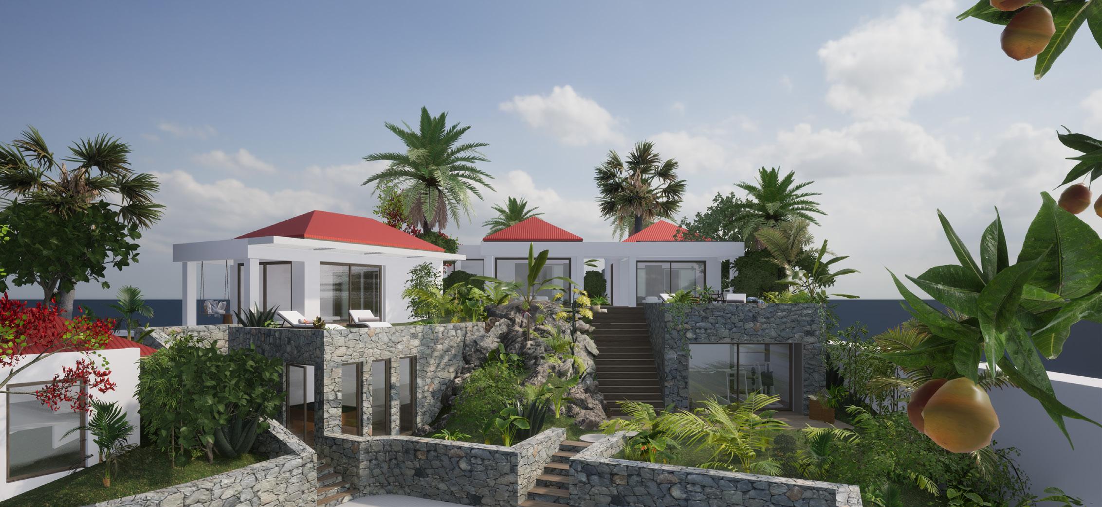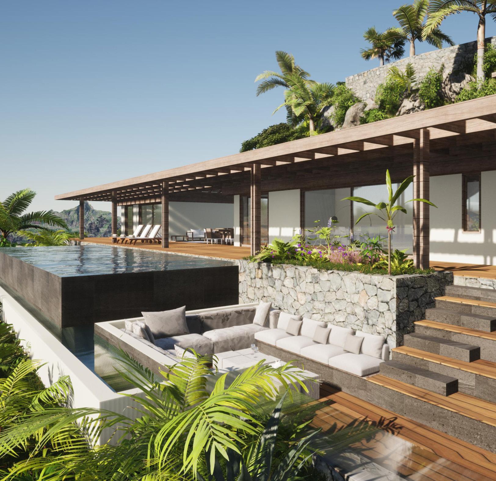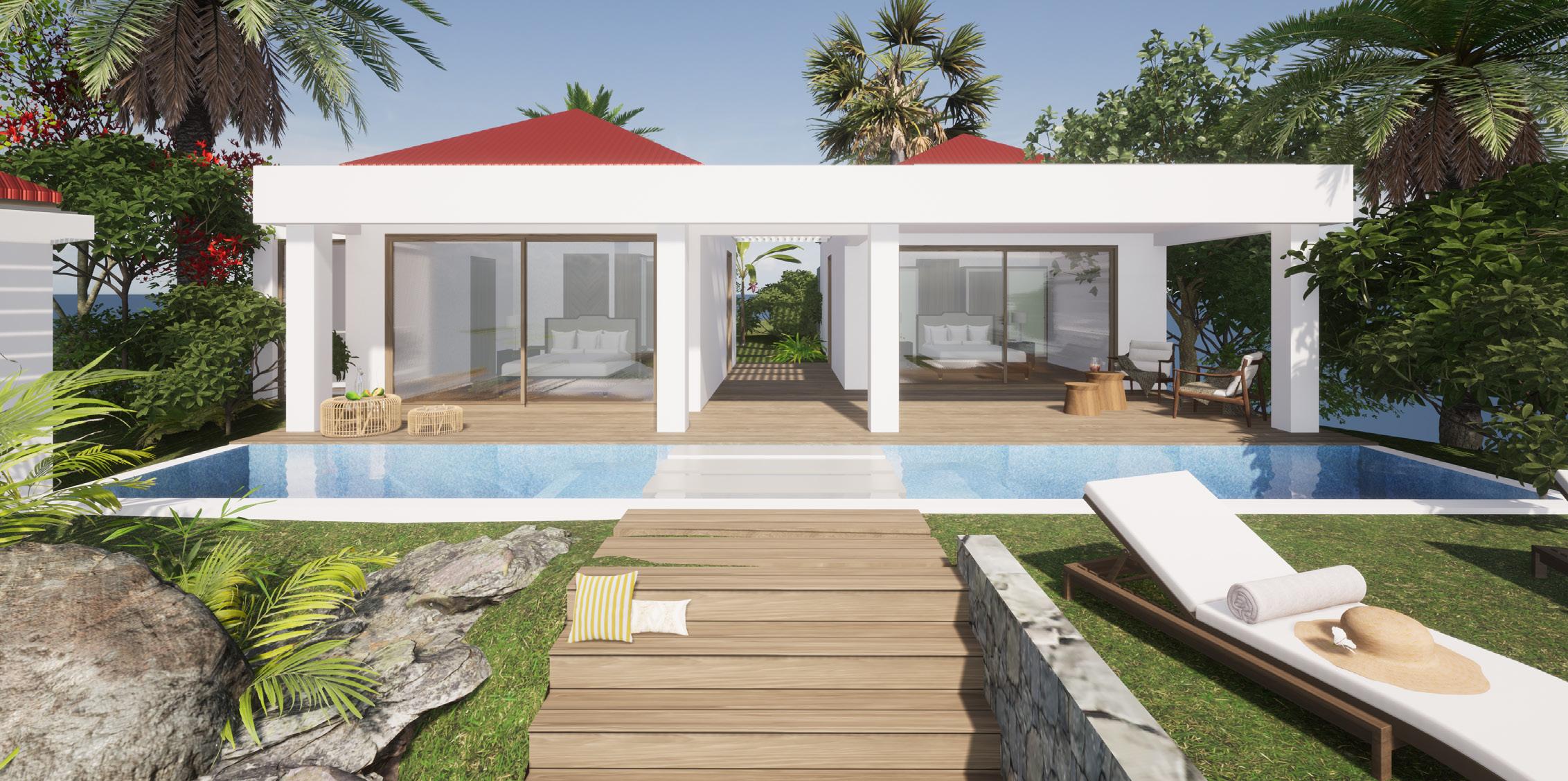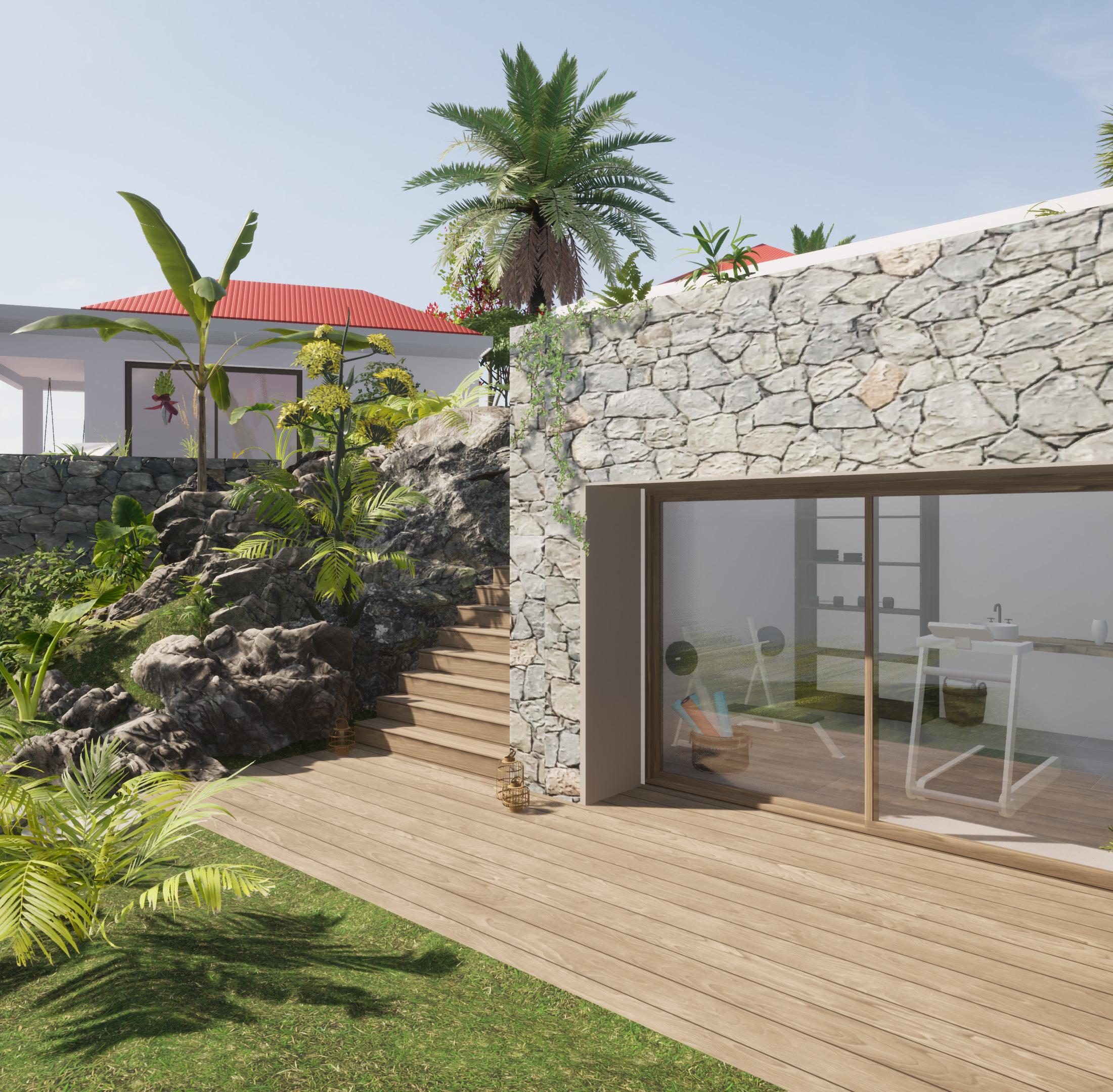Resolutely modern, Villa Bellissima is one of the most spacious villas located on the island of Saint Barthélémy. Indeed, the project consists in the realization of a villa extension with the addition of three bedrooms, a gym and a TV room, to further improve the offer of the current villa Bellissima. Following the topography of the land and seeking to preserve as much of the intrinsic natural qualities of the site as possible, we chose to retain a large volcanic rock and include it in the design of the extension. This rock guides the visitor’s path by being included in the continuity of the main staircase leading to the two largest rooms. At the top of the staircase, we crosse a pool thanks to Japanese steps, thus giving a real serenity to the place. The view over the Caribbean Sea is the final touch to the exceptional character of the place.