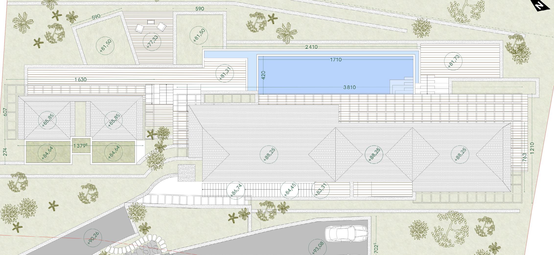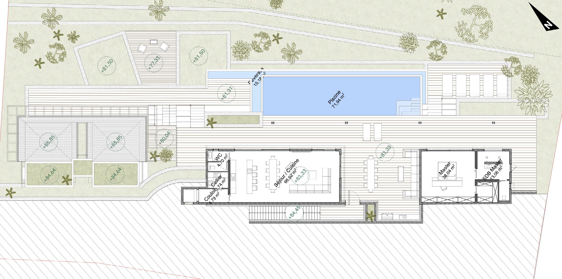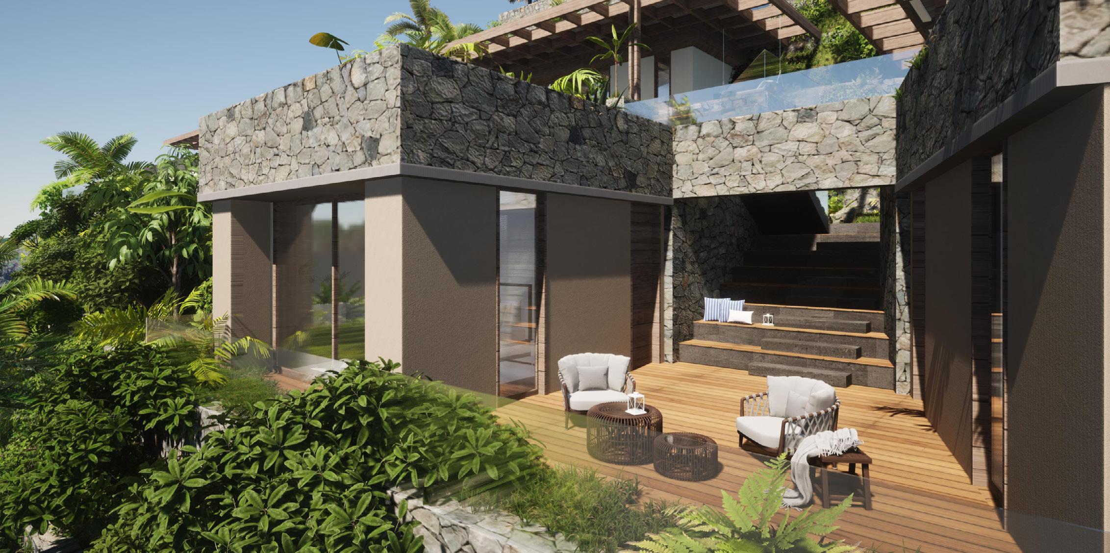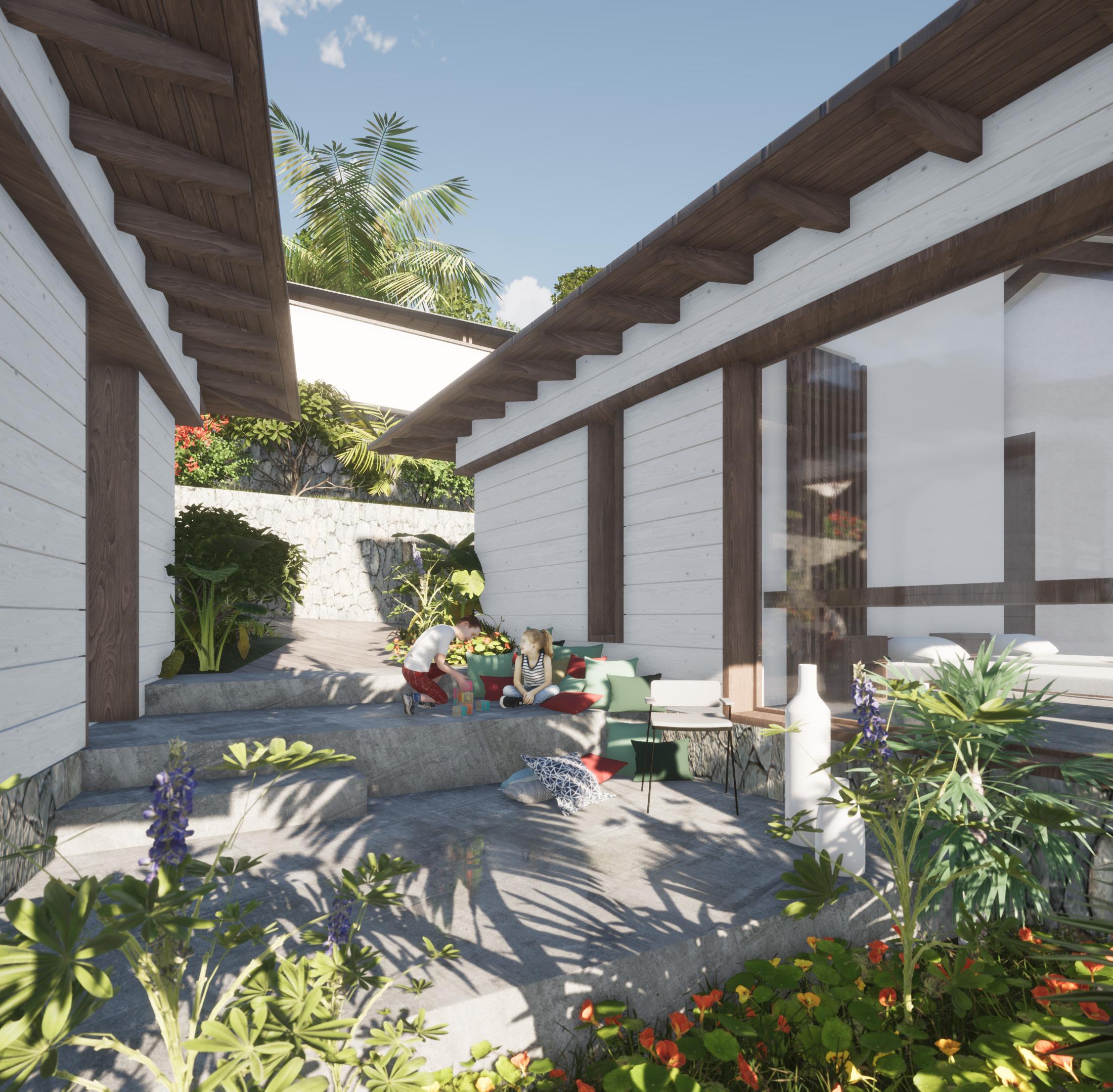 Resolutely modern, Villa Bellissima is one of the most spacious villas located on the island of Saint Barthélémy. Indeed, the project consists in the realization of a villa extension with the addition of three bedrooms, a gym and a TV room, to further improve the offer of the current villa Bellissima. Following the topography of the land and seeking to preserve as much of the intrinsic natural qualities of the site as possible, we chose to retain a large volcanic rock and include it in the design of the extension. This rock guides the visitor’s path by being included in the continuity of the main staircase leading to the two largest rooms. At the top of the staircase, we crosse a pool thanks to Japanese steps, thus giving a real serenity to the place. The view over the Caribbean Sea is the final touch to the exceptional character of the place.