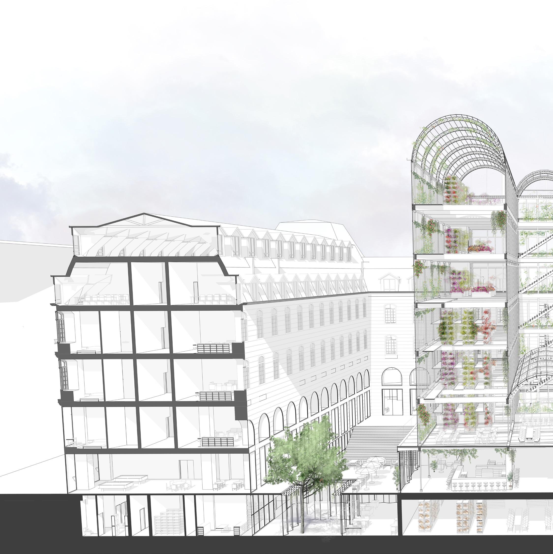 Give a new breath to the île de la Cité, make it attractive, desirable for the insular residents, the Parisians and the visitors of the Parisian capital: this is the ambition of the project. The insular passage has for vocation to create a link between all the assets of the island, by using and reinterpreting the Parisian passages’ codes in a monumental urban farm. The principal aim of this urban farm is the conception of an agricultural and floral place of production. But it also becomes a perambulation area, by recreating the dynamic, vibrant and spectacular atmosphere of those covered galleries of the years 1820, at the dawn of the years 2020. By proposing a walk of discovery around the theme of agriculture and gastronomy, and specially around edible flowers, the Insular Passage delivers a journey full of visual, olfactory, gustatory and recreative experiences. A unique and almost magic moment of escape, in the heart of Paris.