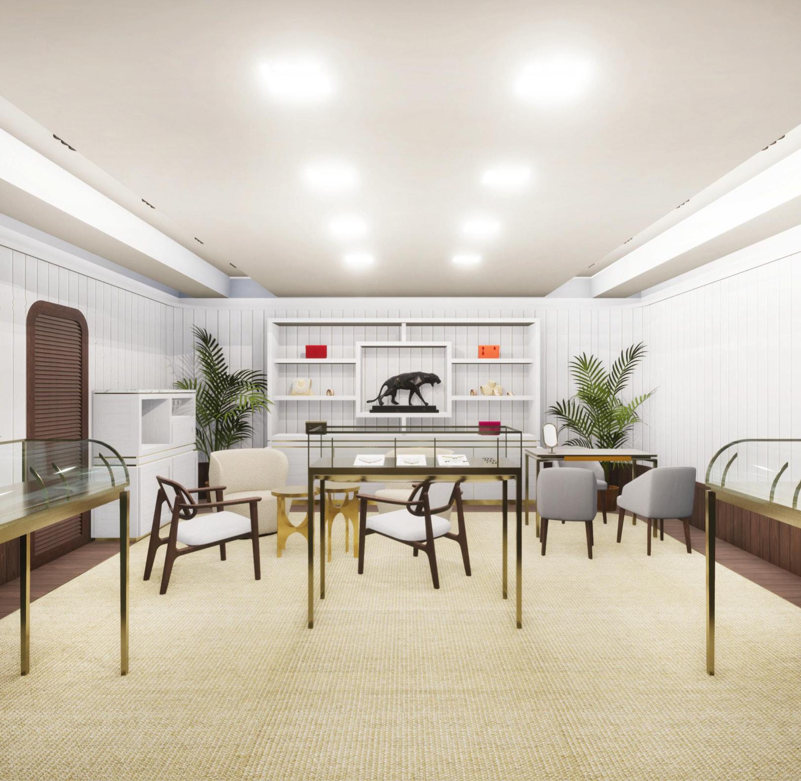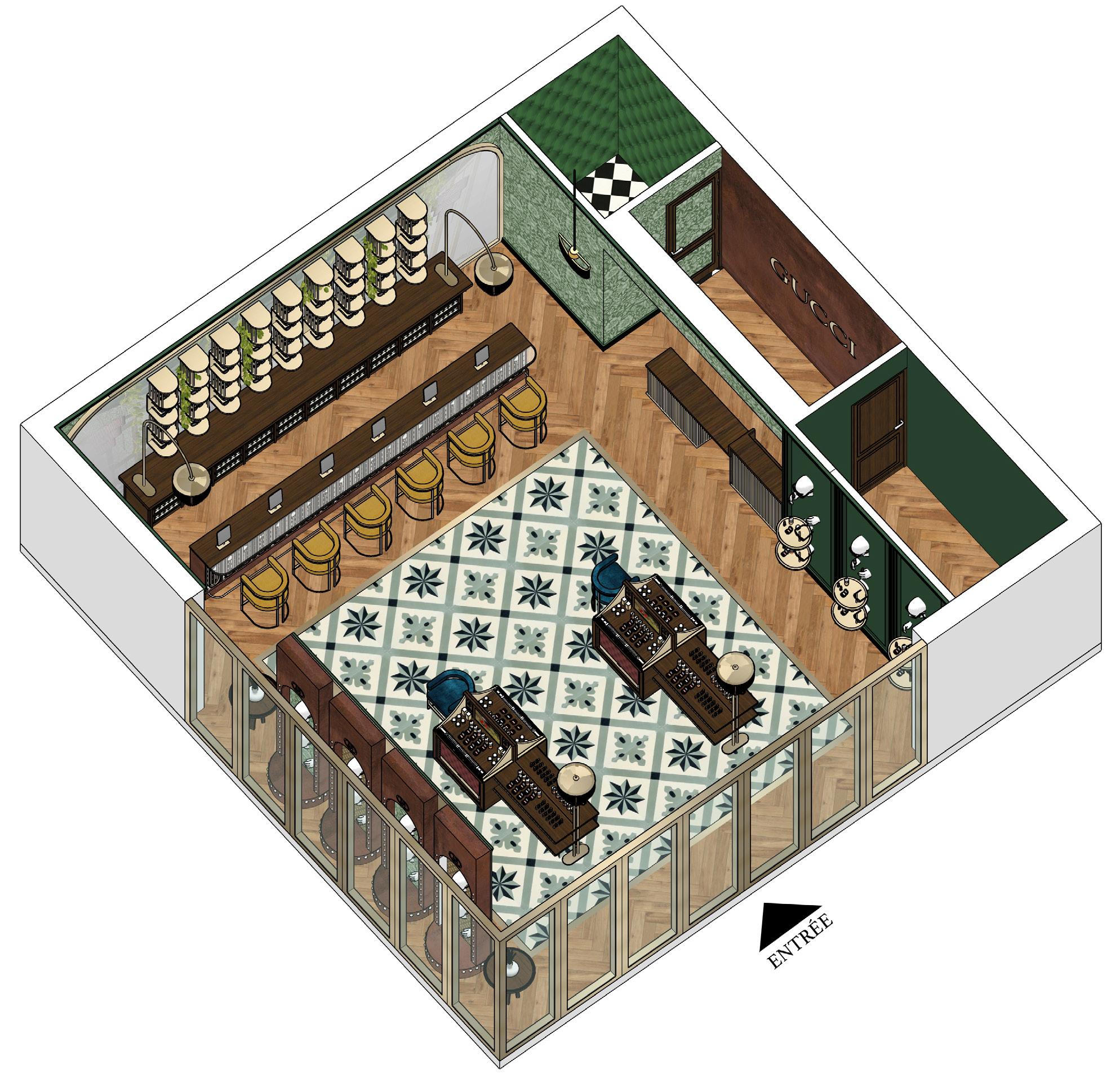 The intention of this Gucci shop project is to create a warm, sophisticated space with a touch of decadence in the image of the Gucci house. To achieve this, the idea was to recreate a vintage lounge atmosphere, as often seen in Gucci advertising campaigns, with a bar area that will allow the eyewear ranges to be displayed in an original way, but also to reinforce this image of a Roaring Twenties lounge thanks to a barman serving behind the counter.