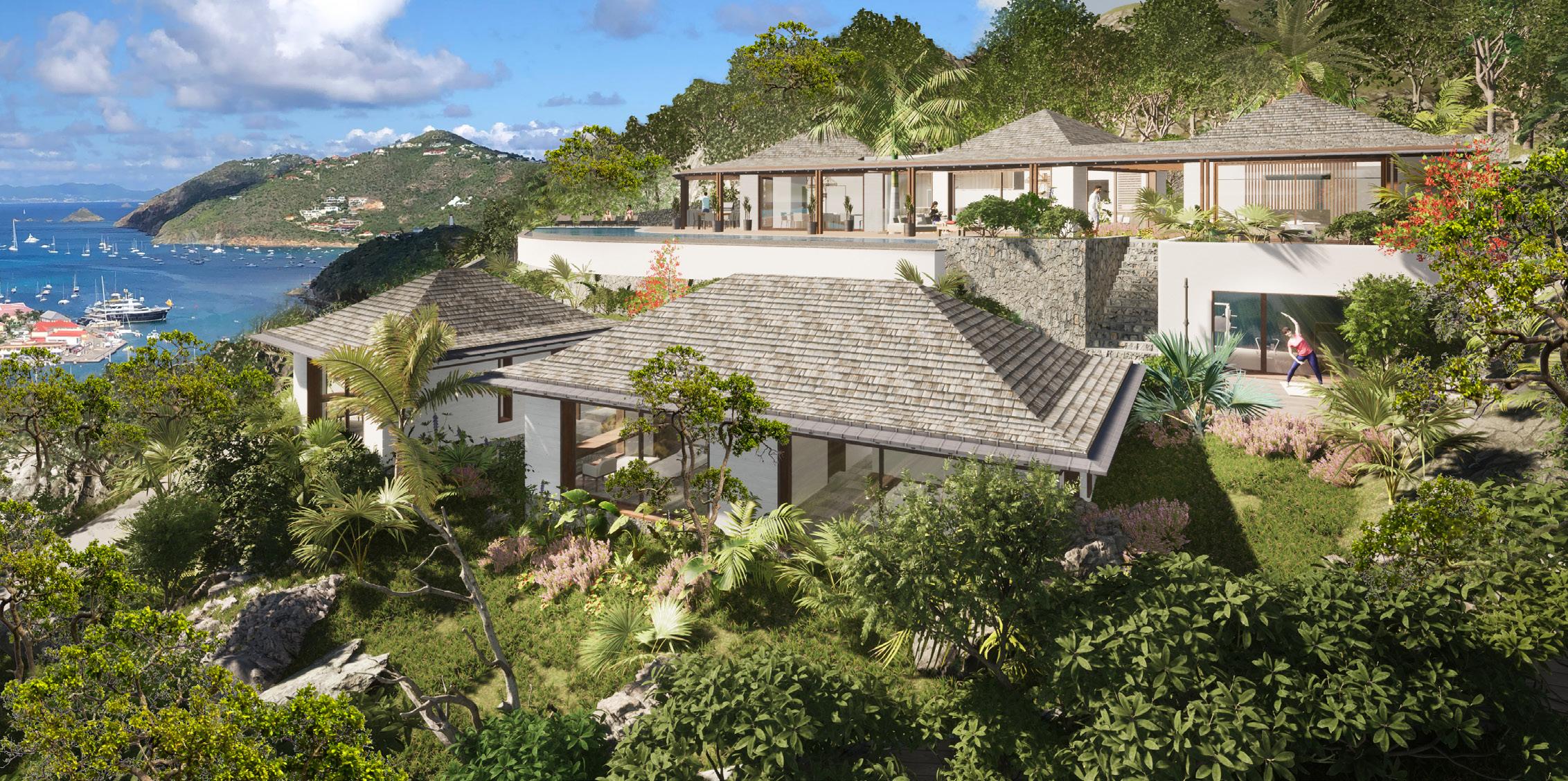 Located on the heights of Saint Barthélémy, the Summer Breeze villa is nestled on a cliffside in a vast tropical garden. It offers a breathtaking view of the Caribbean Sea. Composed of several bungalows located in a natural environment, this 5-bedroom villa embraces the steep terrain of the cliff, thus placing it in an intimate setting in the heart of nature. An outdoor swimming pool flows into a sunken pool surrounding an outdoor living room, like an embrace. The privacy is perfect and the sea view breathtaking. The exteriors are very well laid out to create real additional living space. The atmosphere of the house combines Caribbean carefree living with a zen-like tranquillity.