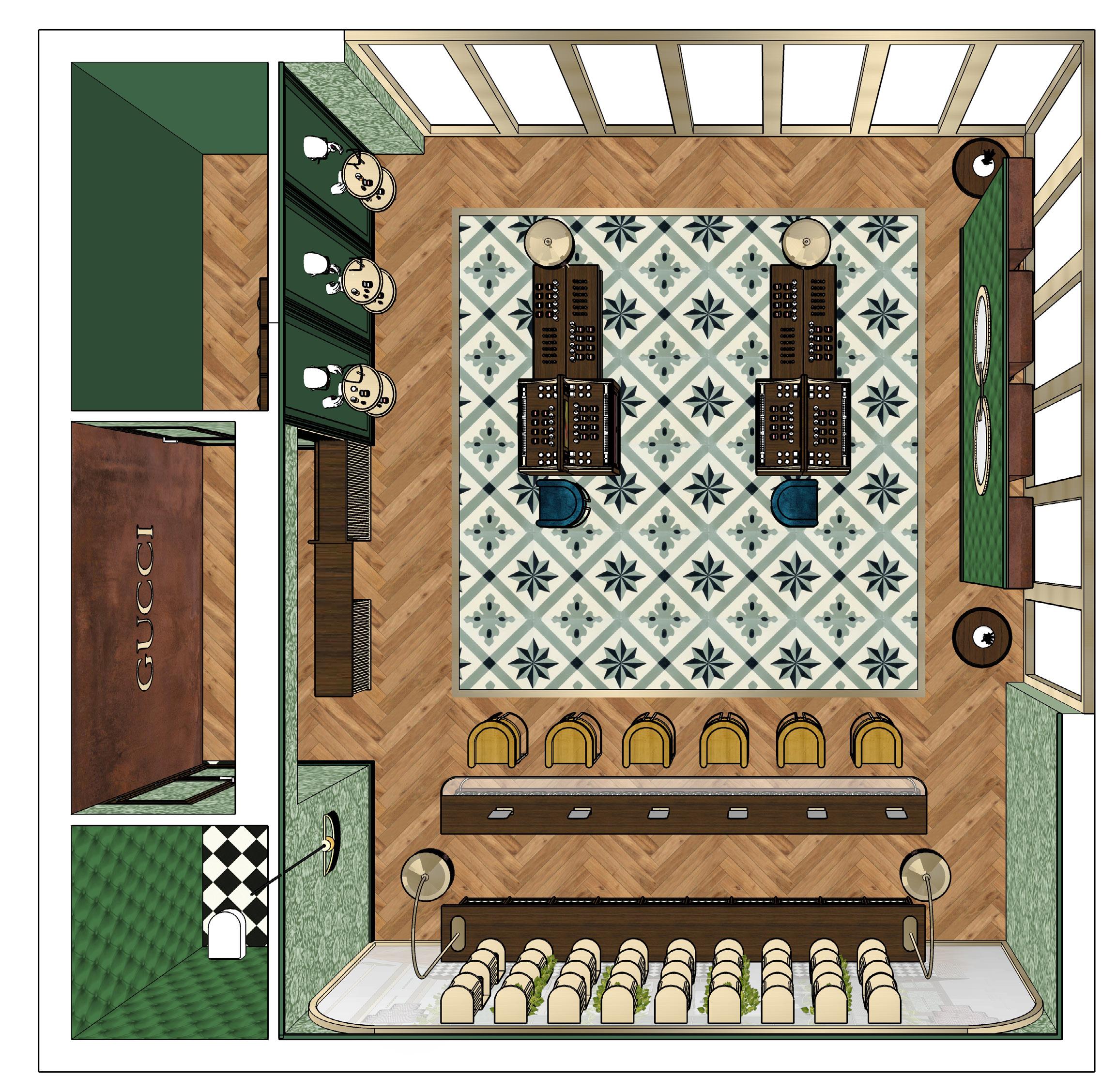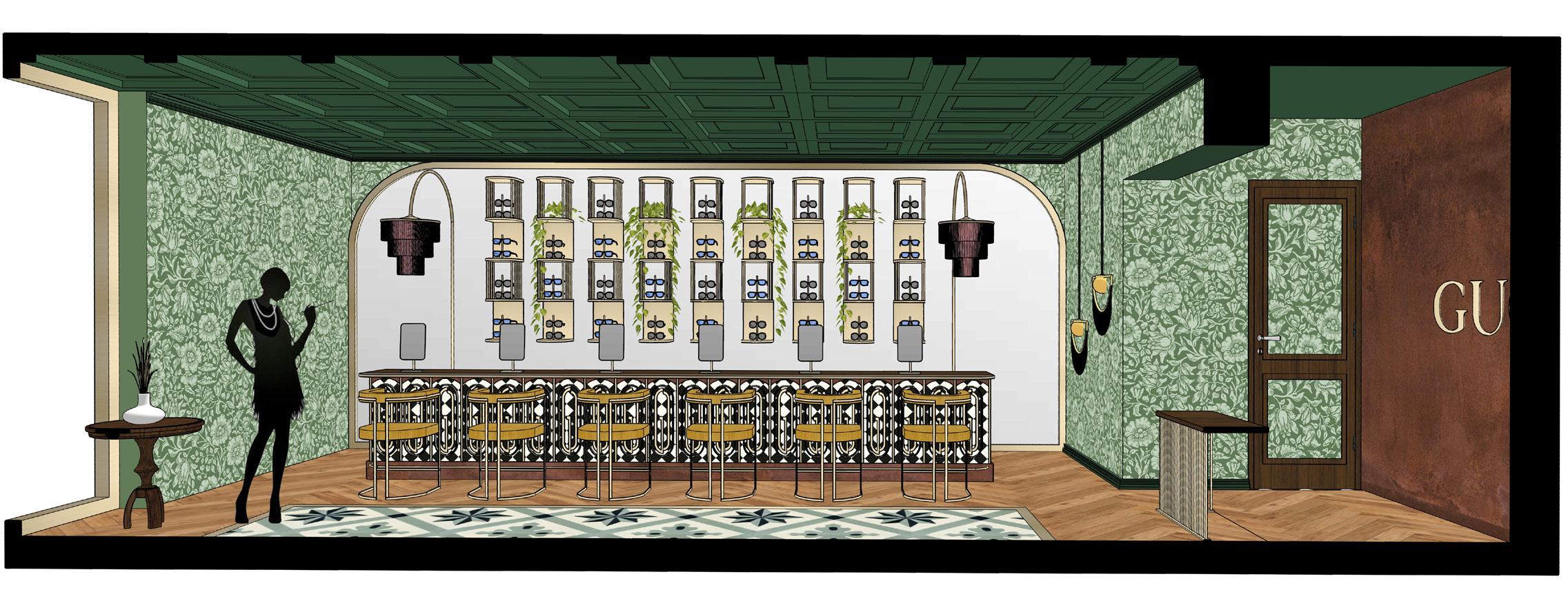 L’intention du projet de la boutique Gucci est de créer un espace chaleureux, sophistiqué avec une touche de décadence à l’image de la maison Gucci. Pour cela, l’idée a été de recréer une atmosphère de salon vintage, comme on le voit souvent dans les campagnes publicitaires Gucci, avec un espace bar qui permettra d’exposer les gammes de lunettes de façon originale mais aussi de renforcer cette image de salon des années folles grâce au balai d’un barman servant derrière le comptoir.