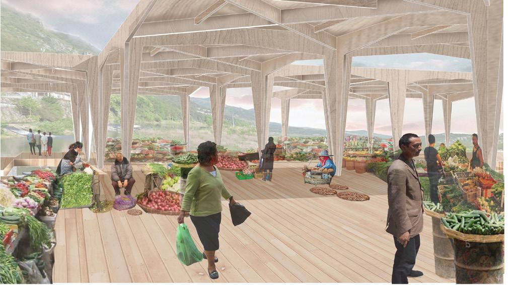The project is to propose a floating market to sell local products and promote the know-how of the Caikantou’s inhabitants, but also of the surrounding villages, thus creating an important emulation on the valley’s scale. On the mountain side, processing and storage workshops allow a connection between the crops and the village in order to be able to transport the harvested and processed products to the sales area. The interest is to create interfaces that encourage on the one hand the visitors to discover the village by crossing the market, and on the other hand that revive the food potential of the mountain for the benefit of the villagers.