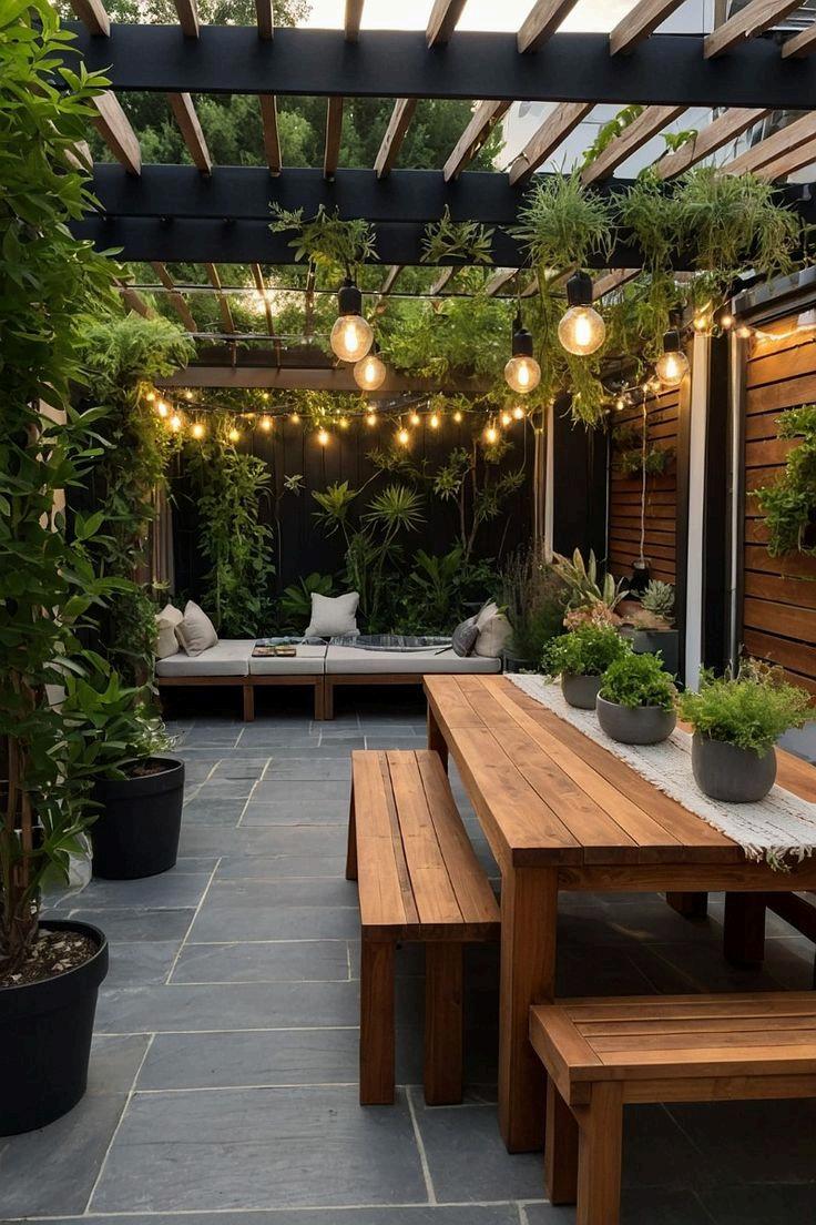 Pérgolas: Ofrecen sombra y estructura, ideales para crear un espacio para sentarse o cenar al aire libre.