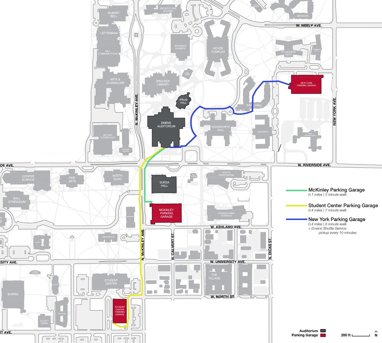 PARKING GARAGES Event parking is available in garages after 6 p.m. Recommended parking is available in the McKinley Avenue Parking Garage (across the street from Emens) at McKinley and Ashland Avenues. The New York Parking Garage is located to the east along New York HANDICAPAvenue. PARKING For many events, handicap parking will be reserved in the lot to the east of the Health Professionals Building off Riverside Avenue. A shuttle cart will be available for patrons unable to walk the distance. Call the Emens box office at 765-285-1539 to confirm availability. FREE SHUTTLE BUS The Shuttle Bus is available from both the McKinley Garage and Student Center Garage for most events. Service begins one hour before the performance and resumes immediately following the show. Call (765)-285-1539 for a show-by-show shuttle schedule. DROP-OFF AREA Circle Drive, located adjacent to Emens Auditorium, is police controlled. Individuals who have difficulty walking long distances can be dropped off along Circle Drive. The driver will be asked to vacate this area immediately in order to allow access to the shuttle buses and others needing the drop-off service. time to shine | 26 parking For directions,turn-by-turnscantheQRcode
