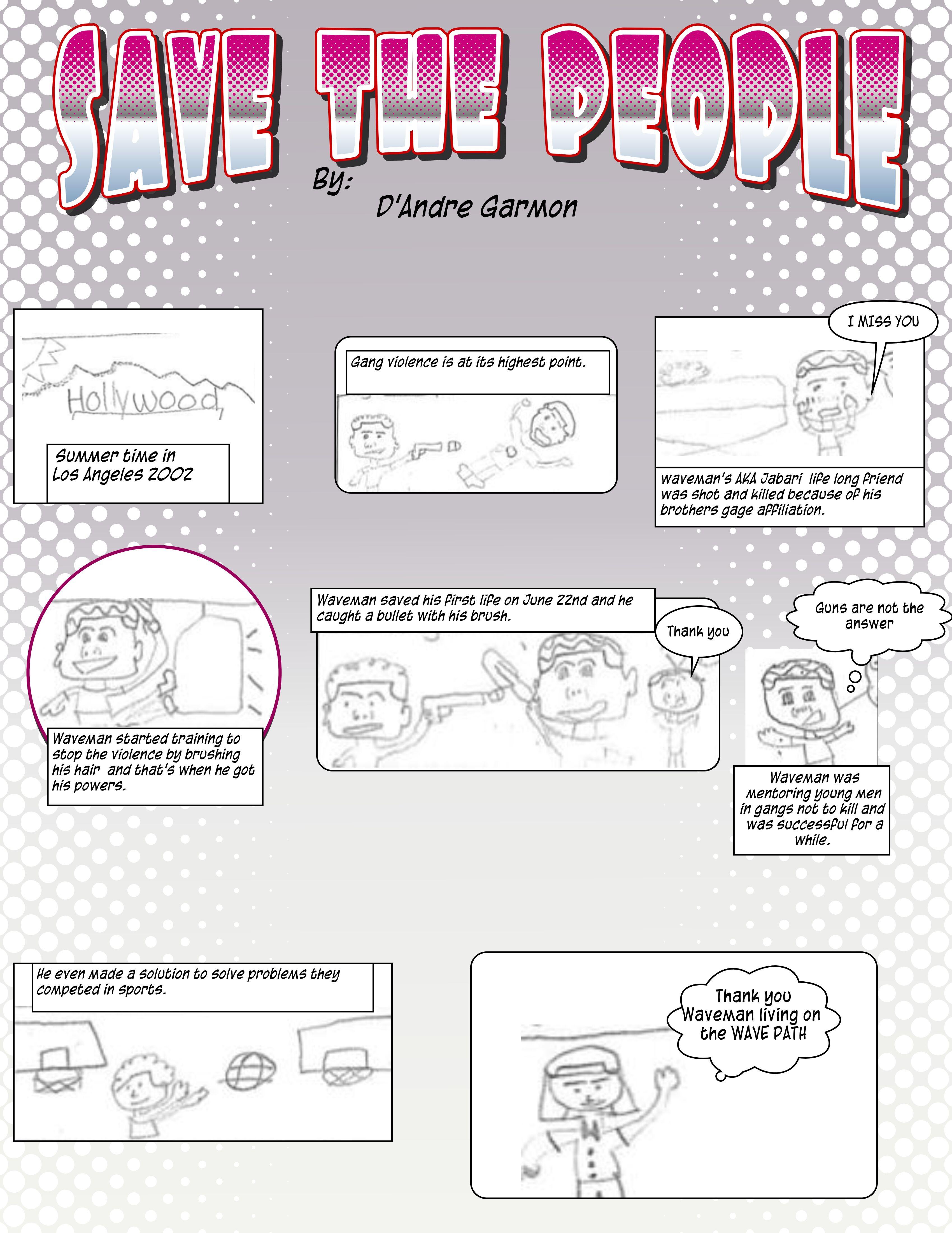 It is noteworthy to mention that the the authors of this graphic novel range in age from 8-17 and that they completed this project at the African American Male Summer Literacy Academy. This African American Male Literacy Academy is hosted at Christ Second Baptist Church in Long Beach and cosponsored by, UCLA Center X California Reading and Literature Project and the 100 Black Men of Long Beach, Inc. We hope that you enjoy, Young Graphic Novelist Dropping Superhero Stories for Culture and Community. We thank you for your support.