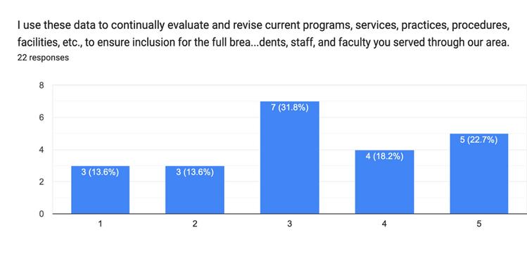 ·A 31% majority “sometimes” use these data to continually evaluate and revise current programs, services, practices, procedures, facilities, etc., to ensure inclusion for the full breadth of students, staff, and faculty you served through our area.