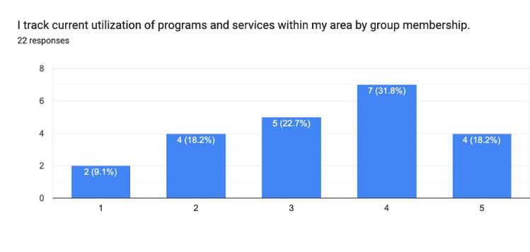 ·31% of participants “almost always” track current utilization of programs and services within my area by group membership, while approximately 23% selected “sometimes”; there was an equal distribution of responses (approx. 18%) between “almost rarely” and “always”, while almost 10% perceived that they “rarely” do so.