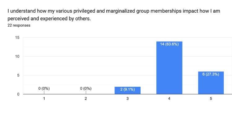 ·While, over 95% of respondents “almost always” and “always” understand how their various privileged and marginalized group memberships impact how they make meaning of situations, and then how they react/respond.