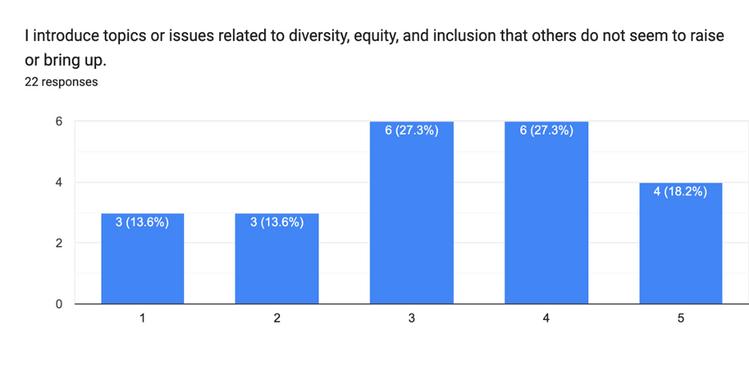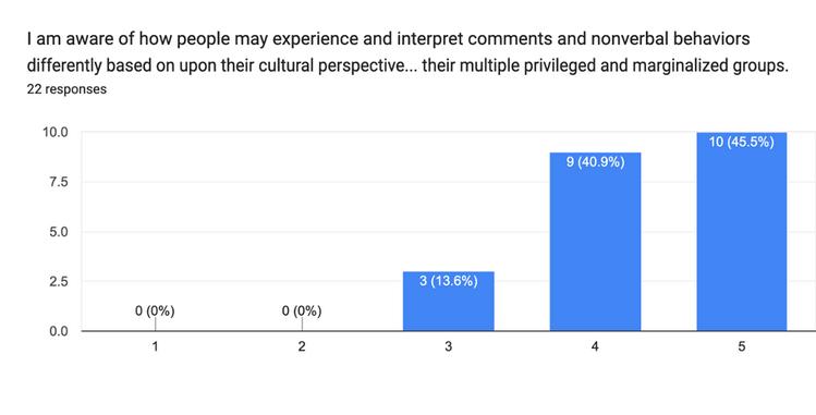 ·Over 85% of participants perceive that they are aware of how people may experience and interpret comments and nonverbal behaviors differently based on their cultural perspective, and their experiences in their multiple privileged and marginalized groups.