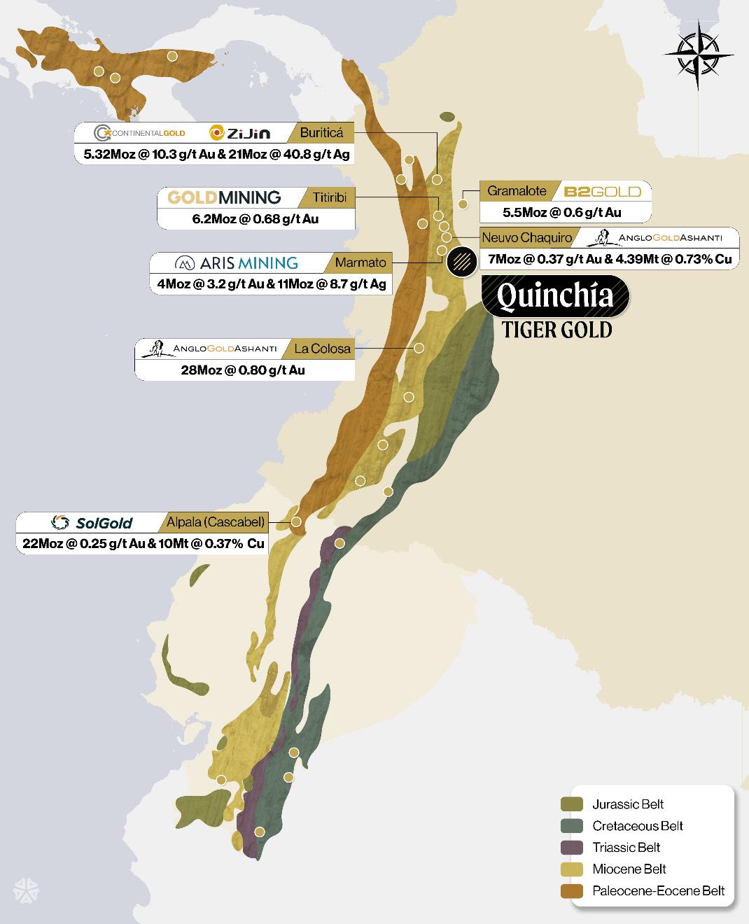 Tiger Gold holds an exclusive option1 to acquire the Quinchía Gold Project, located in Colombia’s Mid-Cauca porphyry belt. This region hosts many multi-million-ounce gold and copper-gold deposits and operating mines2,3, including: