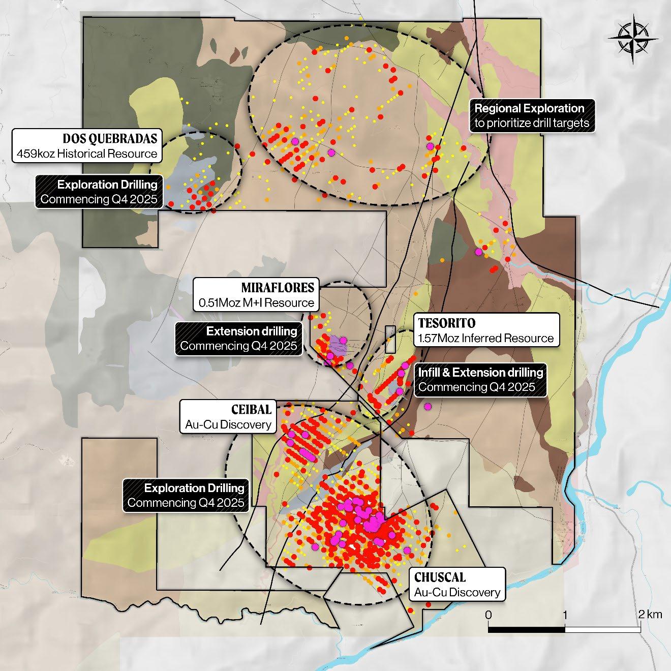 All deposits outcrop and remain open for expansion, indicating significant potential for resource additions. Drilling at Miraflores will test Mineral Resource expansion at depth, while at Tesorito it will test expansion at depth and along strike.