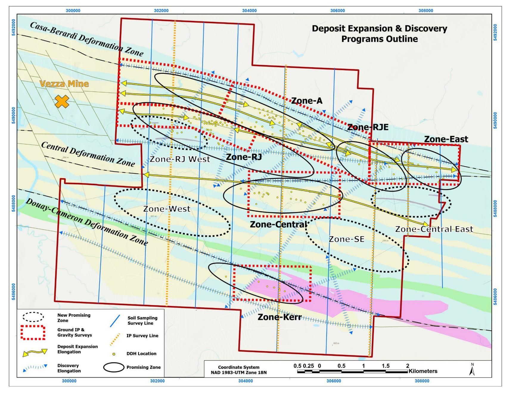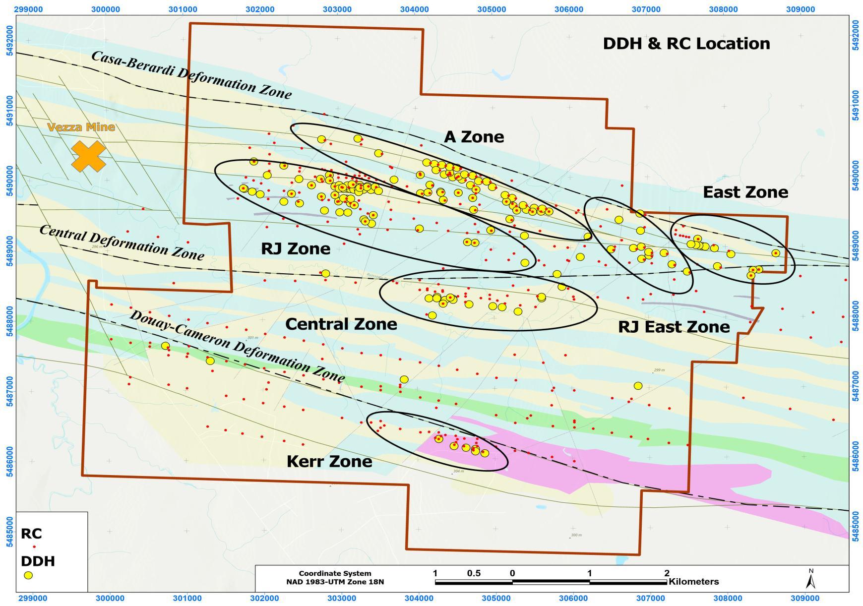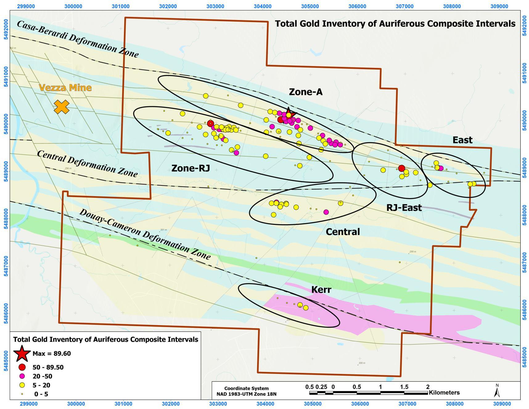 • Six known zones of gold mineralization; two principal zones of gold mineralization are the RJ and A zones, both of which are within the potential capture radius of the Vezza headframe. All six of the zones remain open for expansion, either at depth or along strike