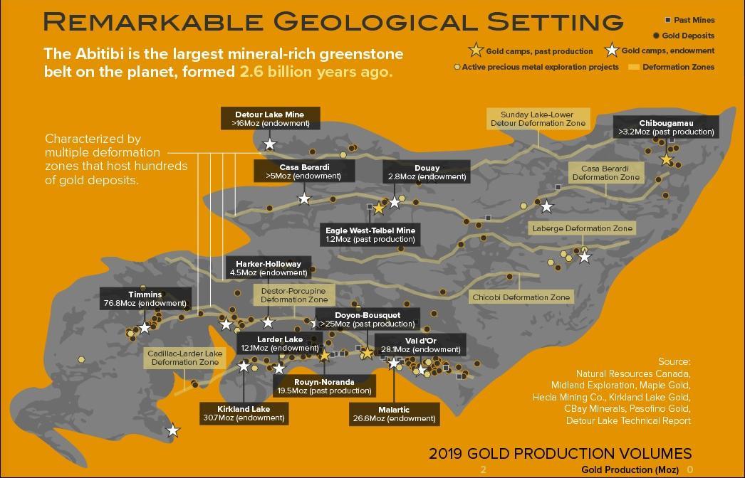 The Abitibi Greenstone Belt is the world’s largest mineral-rich geological belt, hosting many major gold and base metal deposits.