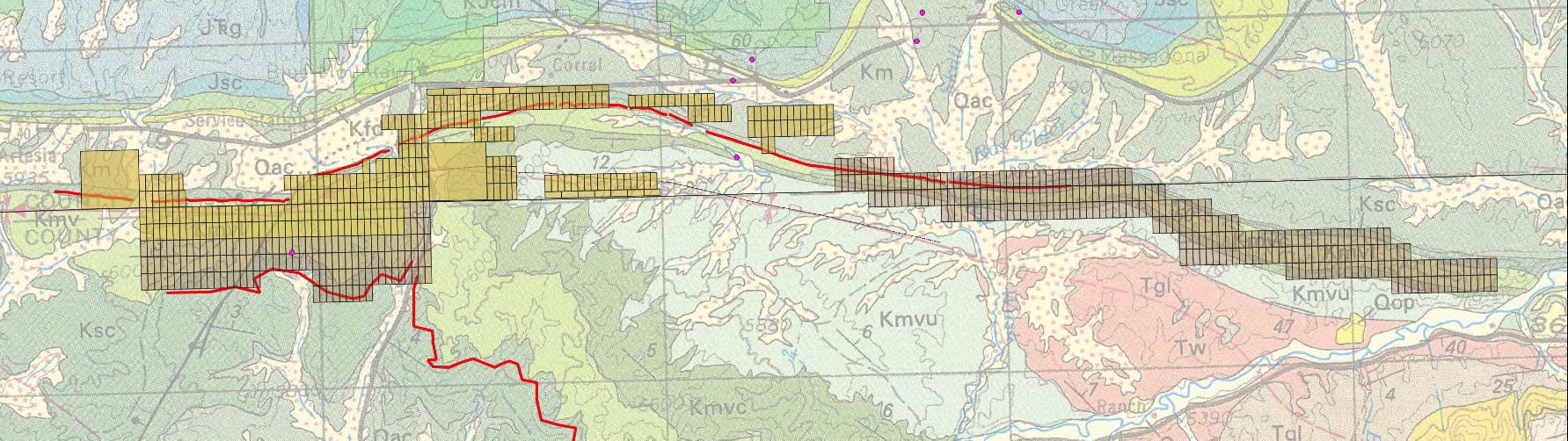 Covers over 35 km of favourable stratigraphy along the northern limb of the Red Wash Syncline