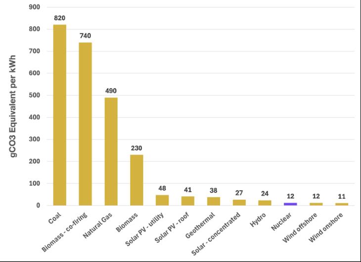 Nuclear power plants produce no greenhouse gas emissions during operation. Over the course of its life-cycle nuclear produces about the same amount of carbon dioxide-equivalent emissions per unit of electricity as wind.